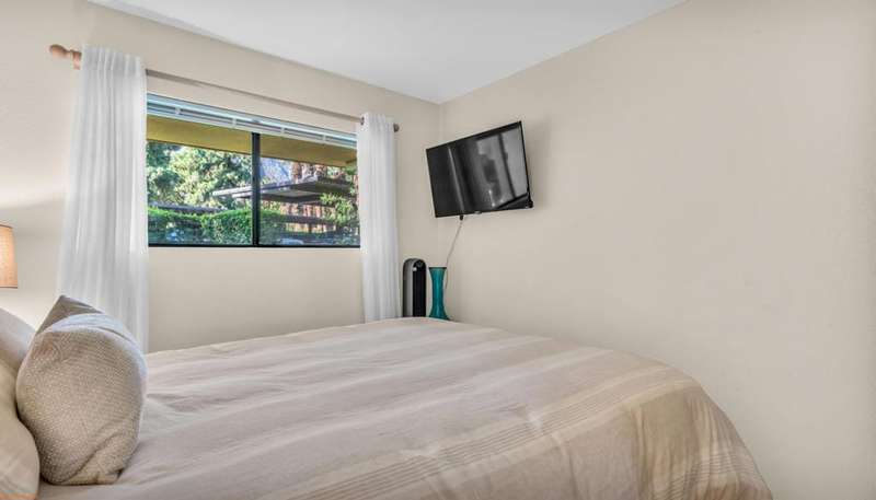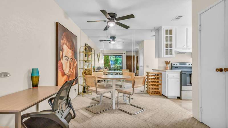 In North Palm Springs, where the breeze helps cool some of the summer days, is this great condo in a gated community available for long-term lease and comes fully furnished. Palm Springs Villas II is a well-managed community where community activities occur frequently, and the community itself is lush and green. This 1-bedroom unit faces south, so the summer sun does not enter your living space. The space has a retro 1980s feel, with what appears to be original carpet, but it is in stellar condition. The walls are adorned with large art pieces to enhance the surroundings further, as are the furnishings. However, both the kitchen and bathroom have been improved. The kitchen features a stunning granite countertop and new cabinetry. The appliances are spotless white. The bathroom has a large walk-in shower with great tile enclosure walls and floor. The home is also near to the community pool and spa, and to one of the laundry rooms. Outside the community, just across the street from the entry driveway and to your right, is the drive up to the Aerial Tram. If you're interested in downtown, turn left at the same intersection, and you're just a short walk away from all that the City has to offer. However, if you're looking for groceries and retail pharmacy stores, from the front gate, make a left turn and follow San Rafael to Sunrise Street, and then turn right. Or, if you prefer to drive to a hideaway, back on San Rafael, again turn left at the exit driveway and at the first stop light, when the light is green, left turn, and you'll be headed out to Highway 10, where you can drive toward Indio and beyond, or toward Los Angeles. Yes, this community has it all and all the comforts you seek. Please call your agent today to schedule a property preview. You'll be glad you did!