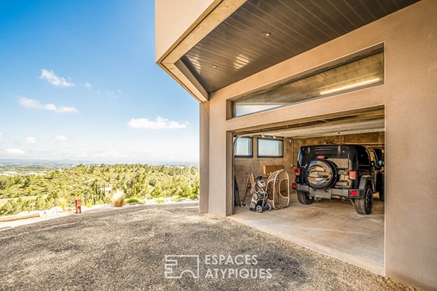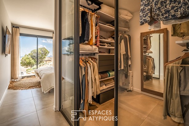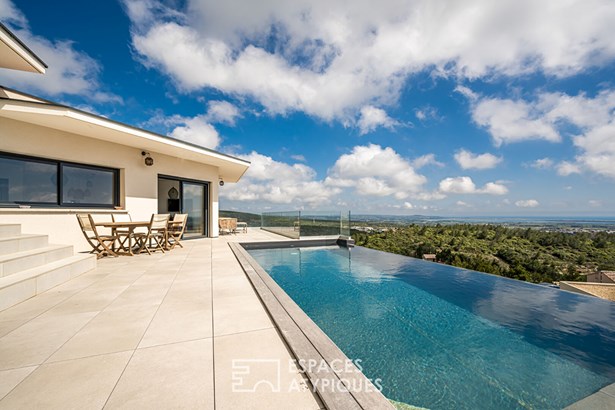 A flight of steps leads up to a vast, east-facing living room of around 70 m2, featuring a top-of-the-range open-plan kitchen. The whole opens onto adjoining terraces and an 8 x 4 metre heated infinity pool. The glass railings, a veritable play on transparency, offer a striking perspective and a breathtaking 180-degree view of the Mediterranean coastline.