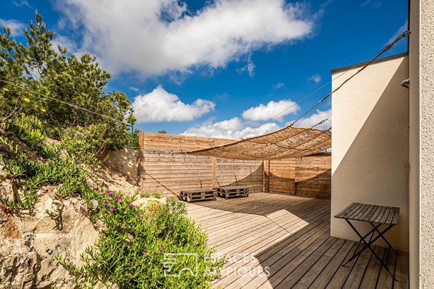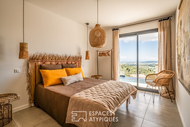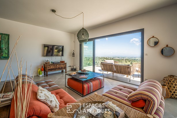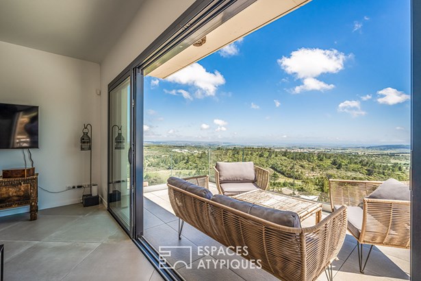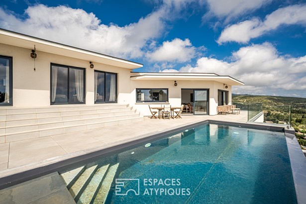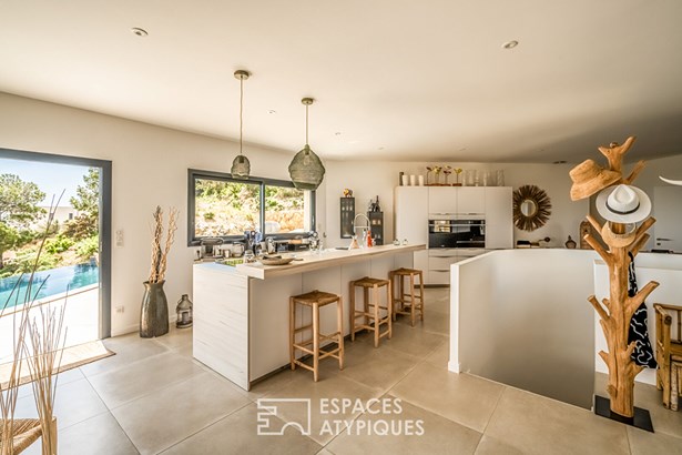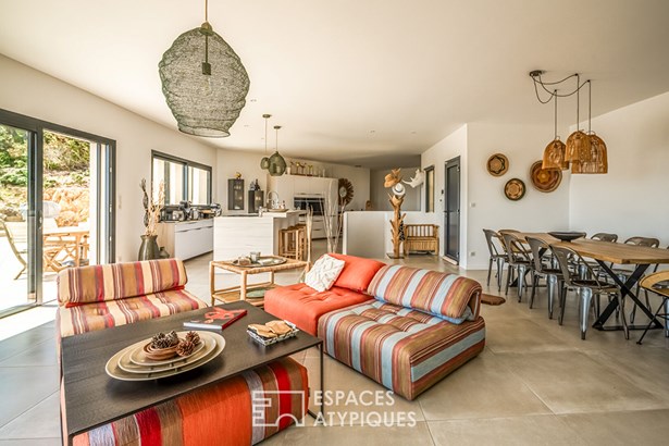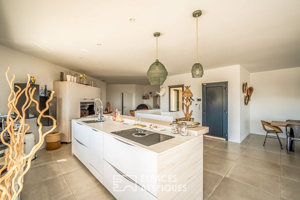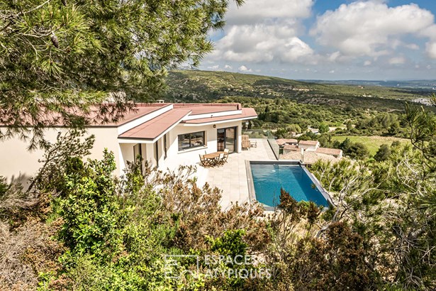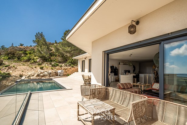 Close to Leucate, in the heart of the Corbieres mountains and a Natura 2000 site, this contemporary architect-designed villa built in 2021, measuring around 165 m2, offers a unique living experience, subtly combining modern comfort with elegant design. As soon as you enter, you'll be immediately captivated by the generous volumes and the natural light that floods into the living spaces, thanks to the large picture windows that open onto a breathtaking panoramic view over the ponds and the Mediterranean Sea.