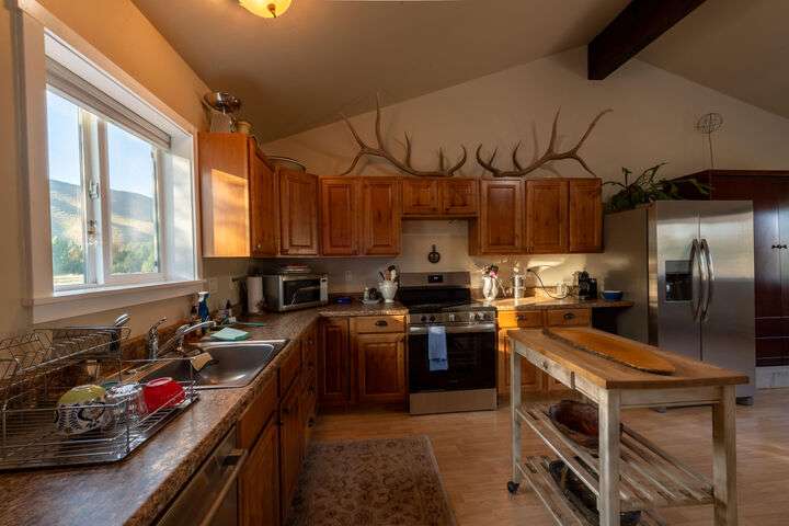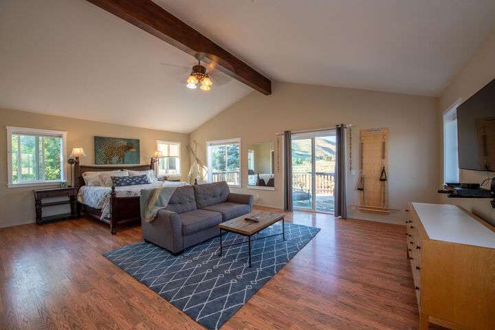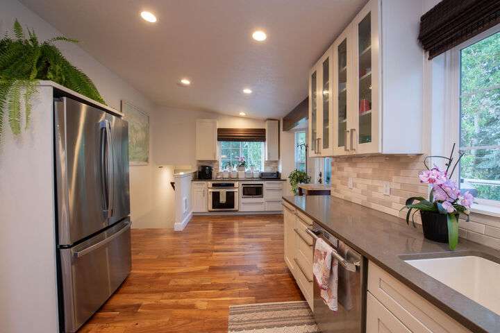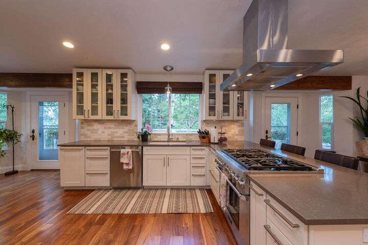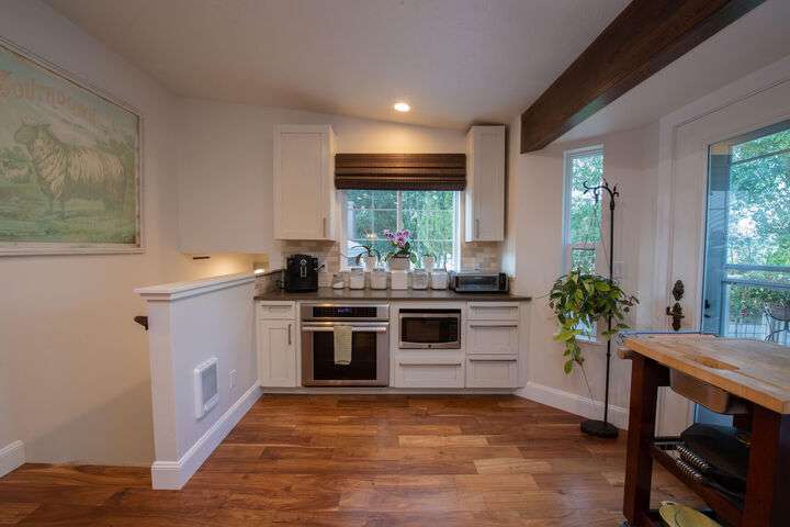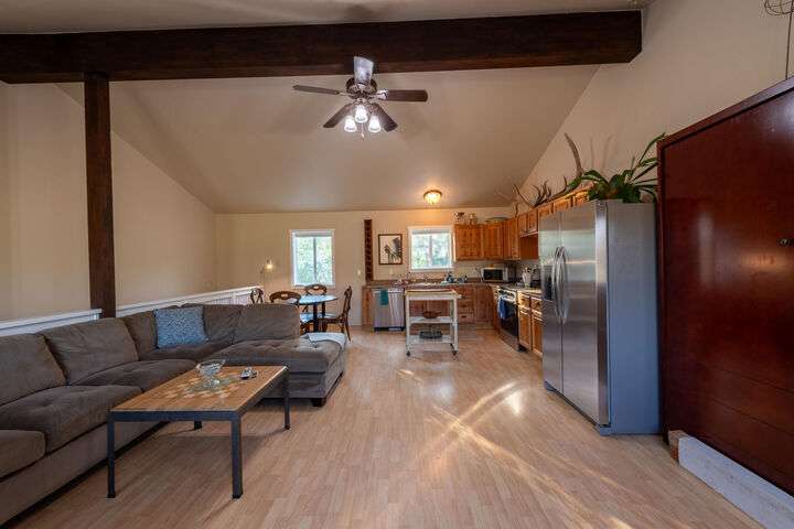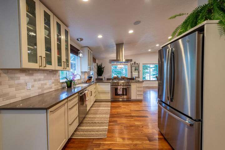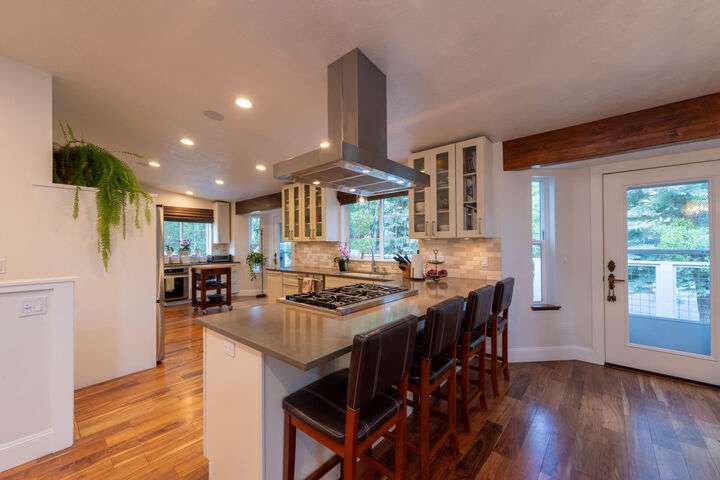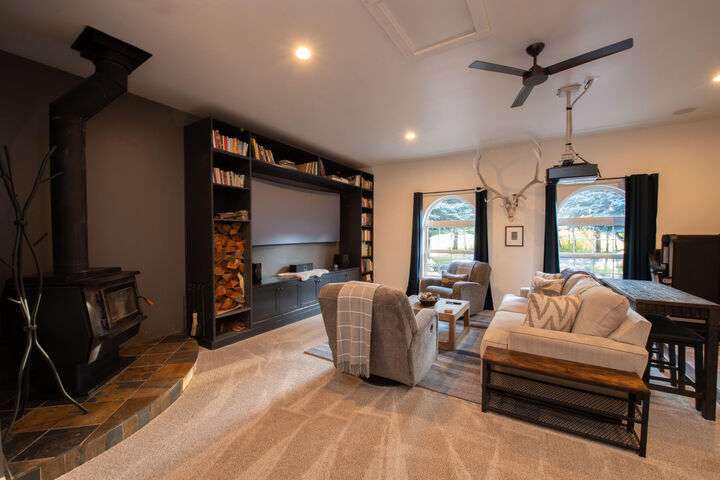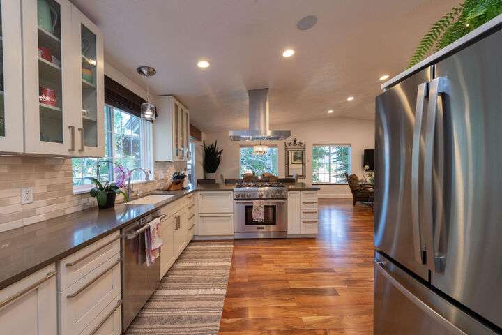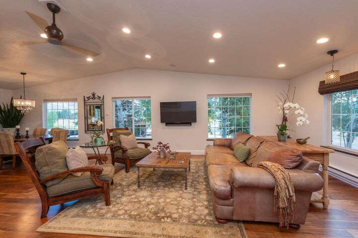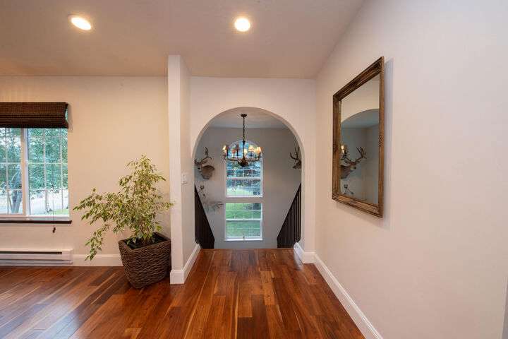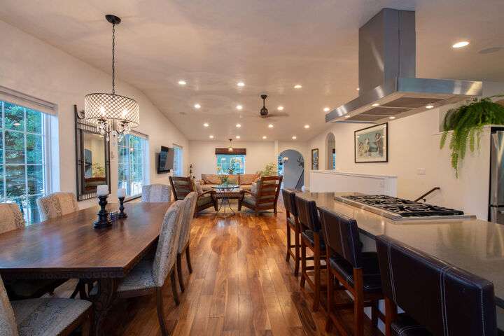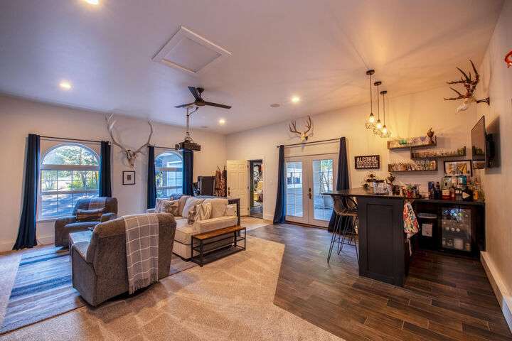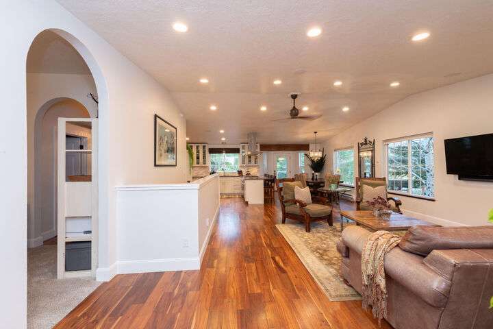 Ranch Style High End Remodel property, with lots of bells and whistlers for the buyer that has needs for 1,950 sq.ft. of high ceiling garage space. This 5 acre property with mature landscaping is rad, with 4 bedrooms, a office, a media / lounge bar room, and a detached in-law 1,200 home. Price well. Come check it out!