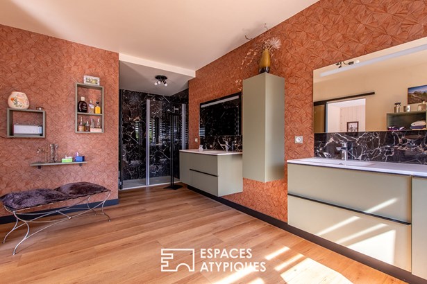 On the ground floor, a vast living room bathed in light thanks to large bay windows, an intimate lounge with a closed fireplace, as well as a master suite with a spacious shower room and separate toilet make up the living spaces. An office and a library complete this level. The fitted and equipped kitchen opens onto a terrace and an intimate patio, adjoining a SPA room which offers a privileged relaxation area. Upstairs, three beautiful bedrooms, one of which has a dressing room, a shower room and toilet, make up the sleeping area. Outside, a second garden leads to the outbuildings and garage, offering numerous development possibilities thanks to their 100 sqm of usable space. They currently consist of a workshop, a woodshed, a teleworking or multi-activity room, as well as a garage.