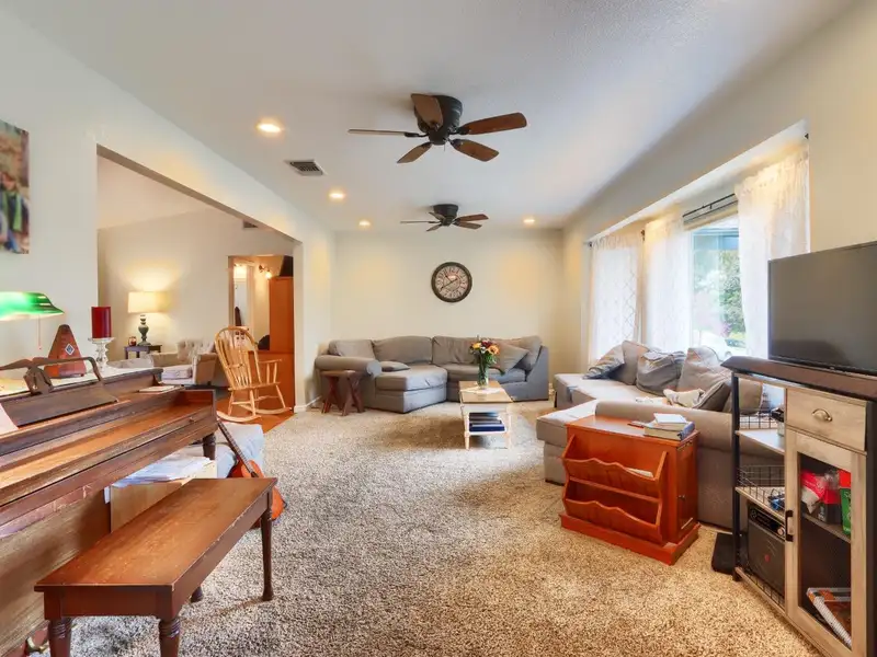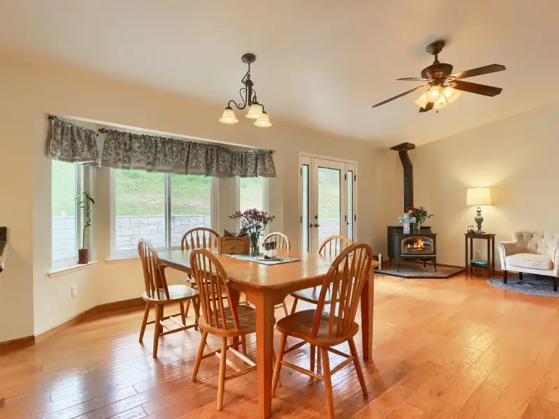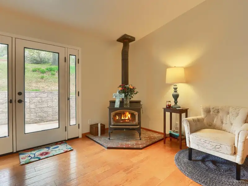 - Open floor plan with wood stove