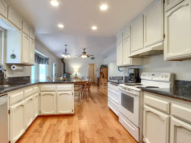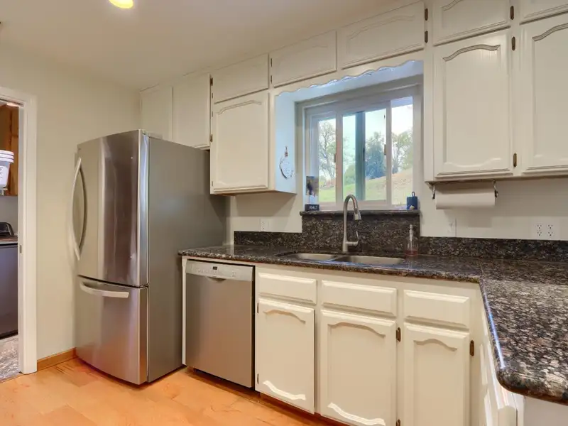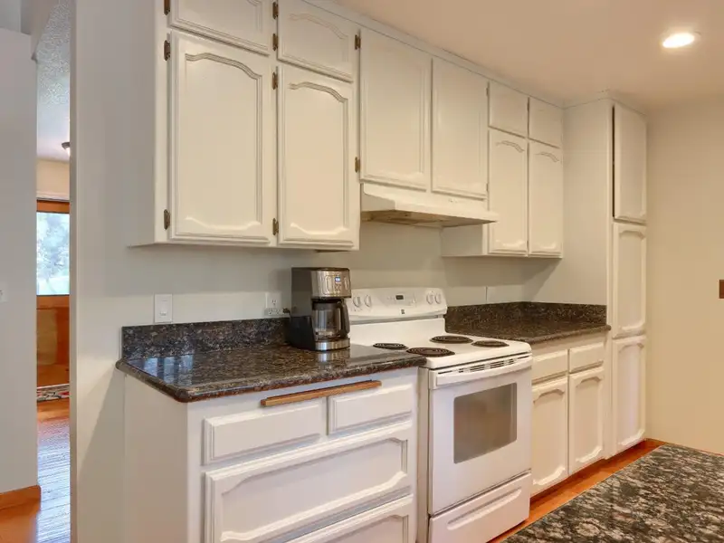 - Kitchen with painted cabinets and granite counters