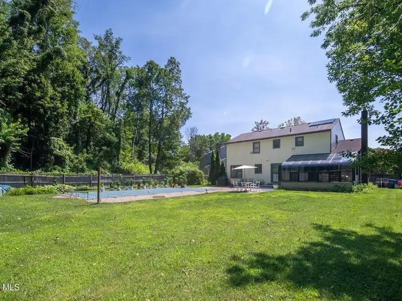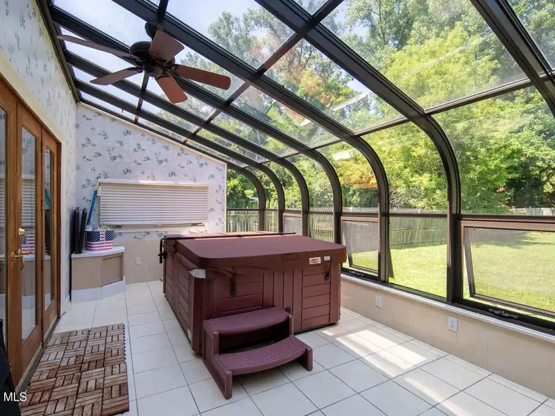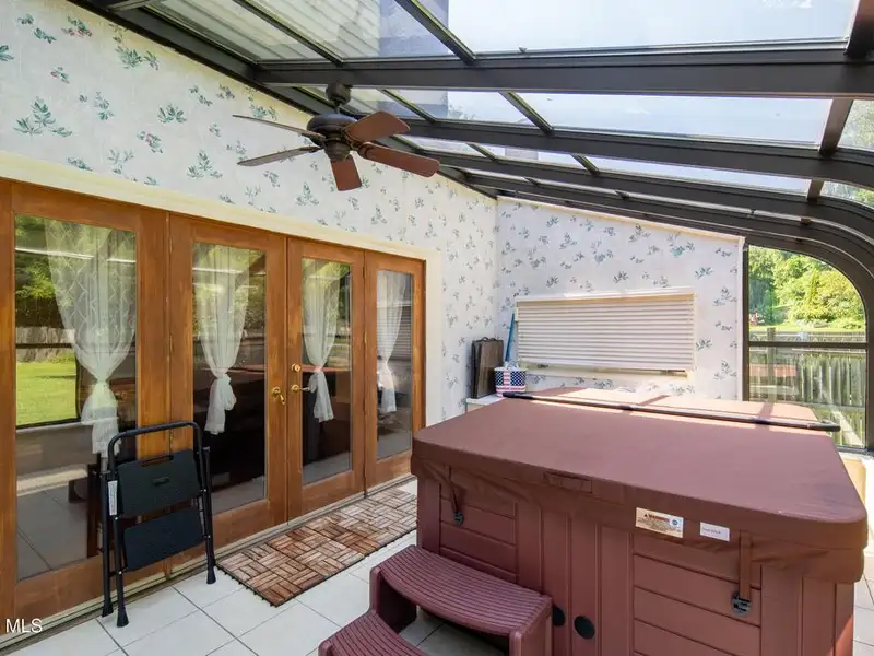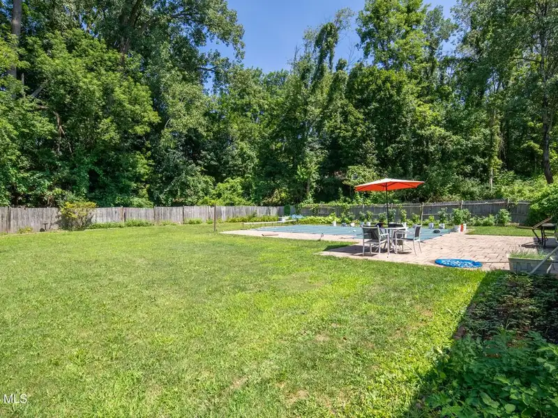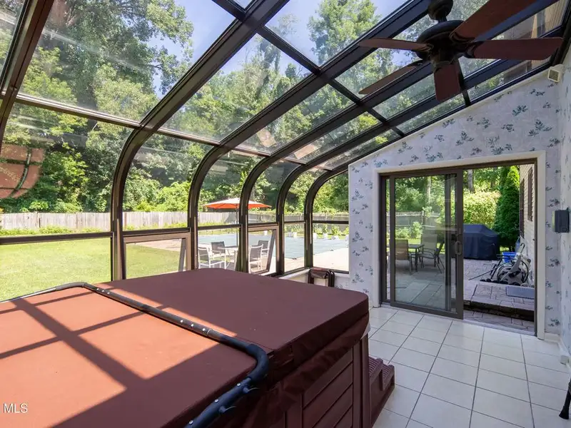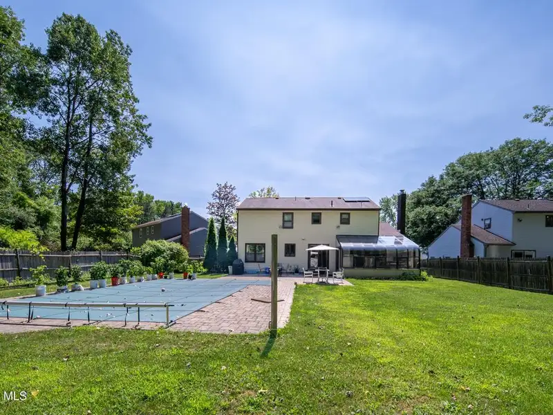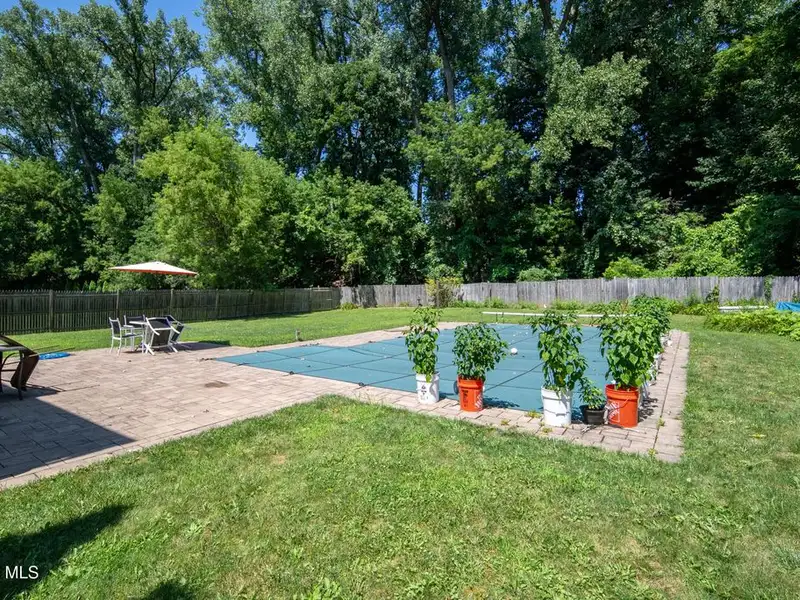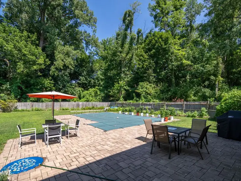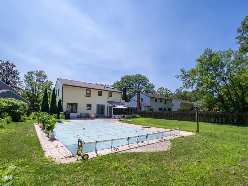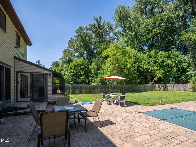 - Fenced backyard with heated pool and stone patio