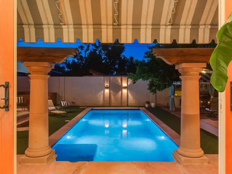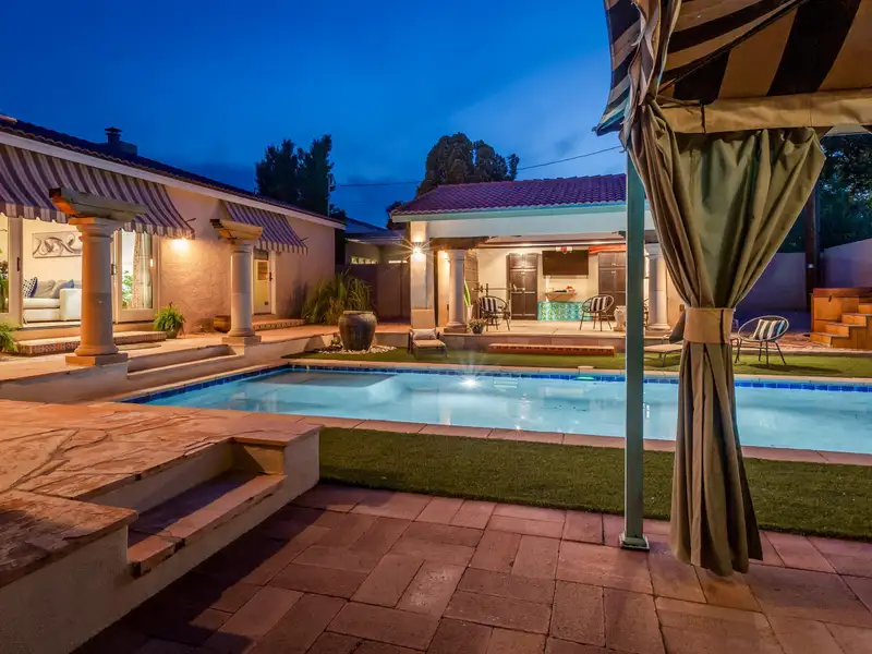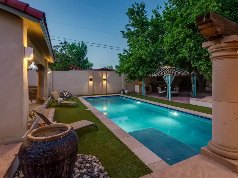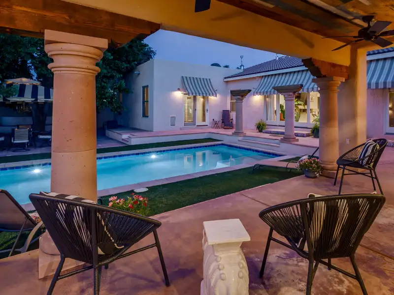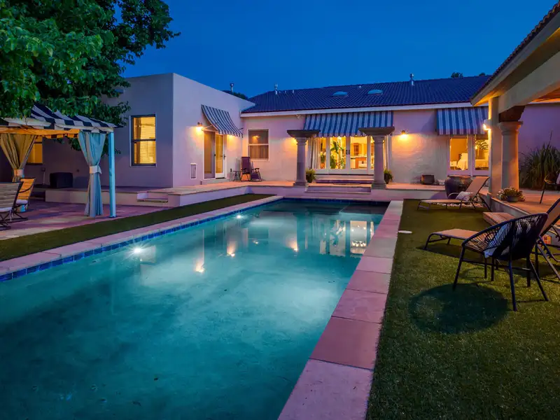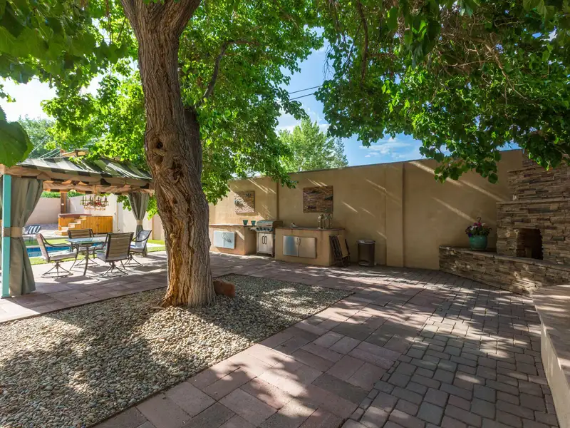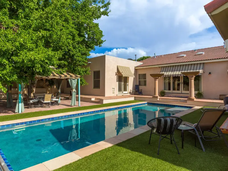 Timeless elegance in the heart of ABQ Country Club.Completely remodeled creating an open flowing floor plan between generous living, dining, den & kitchen spaces.Dramatic view to heated salt water pool from kitchen & den. Kitchen w/island, gas range, stainless appliances,& brkfst nook. Primary bdrm is split from other bdrms & is a true retreat! Dressing area w/custom storage, walk-in closet plus walk THROUGH closet for boots, shoes & purses! Access pool from this peaceful space. Each addtnl bdrm has access to bathrm. 1 bedrm also accesses pool. Fantastic cabana space offers additional outdoor living options plus Japanese hot tub, outdoor fireplace & cooking area.Short distance to Country Club and beautiful tree lined medians. Holidays will include luminarias & glowing hot air balloons.
