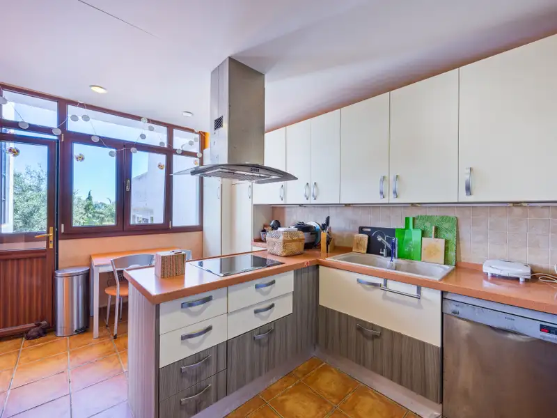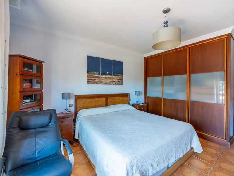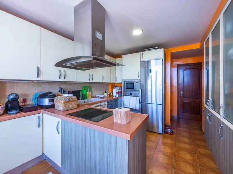 The property is distributed over three floors, offering generous and versatile spaces. On the main floor, there is a large living-dining room with a fireplace, air conditioning, and direct access to a covered terrace (which in turn connects to the patio and kitchen), perfect for enjoying the Mediterranean climate all year round. The fully equipped kitchen communicates with this outdoor area, ideal for family gatherings and al fresco dining.