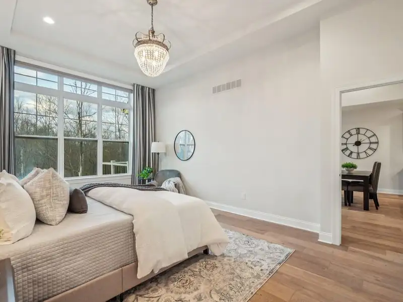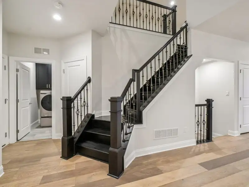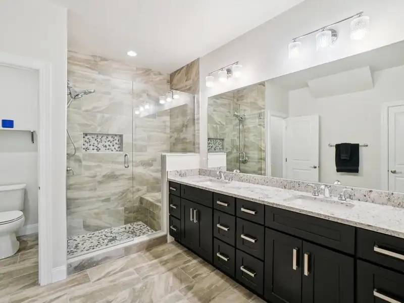 - First-floor primary suite with spa finishes