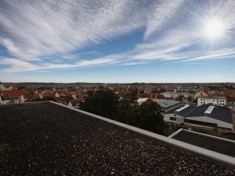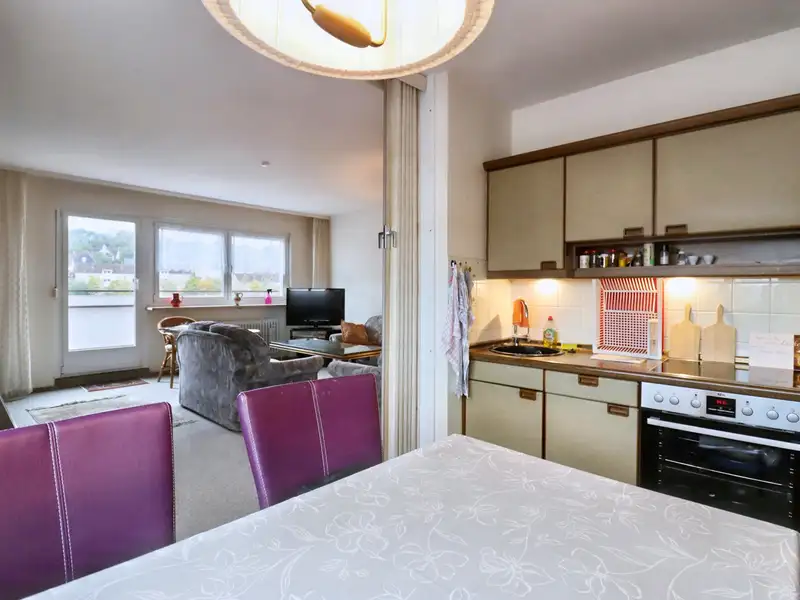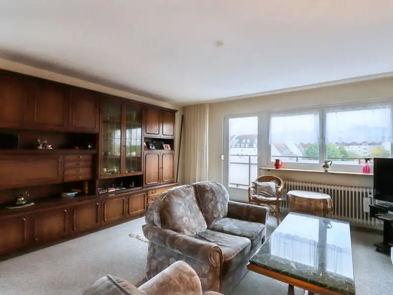 The generously proportioned living room forms the heart of the apartment. From here, you have access to the convenient balcony, which offers a beautiful view over the cityscape and is ideal for relaxing in the fresh air. The integrated kitchenette is functionally equipped and blends harmoniously into the living area. It offers sufficient storage space as well as all the important appliances for daily use.
