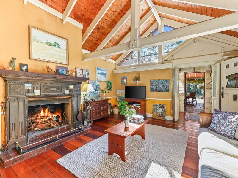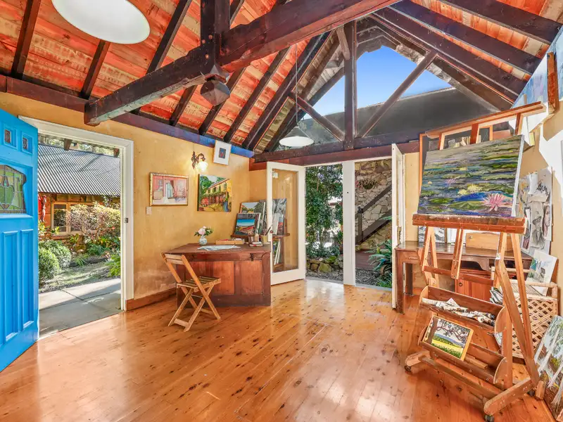Showcasing artisan sandstone, sculptural features, stain-glass windows and skylights throughout, this family home includes three large bedrooms, each with ensuites and walk-in robes, a light filled art studio and, at its heart, the kitchen and living spaces each adorned with inviting wood fireplaces providing warmth and comfort.