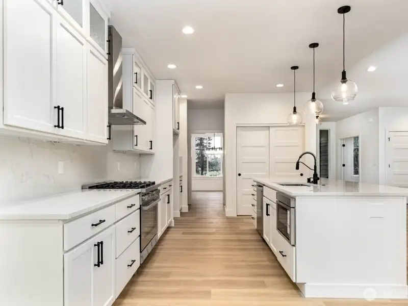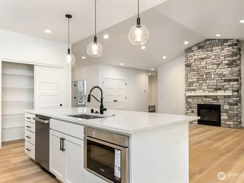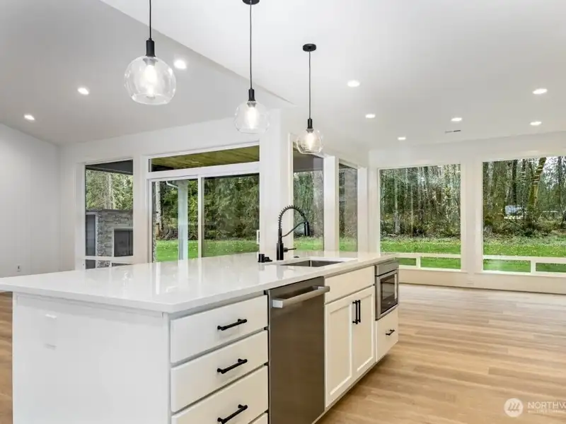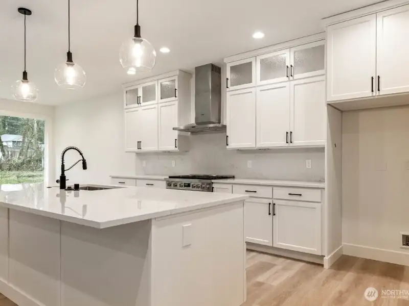- Oversized kitchen island with quartz backsplash