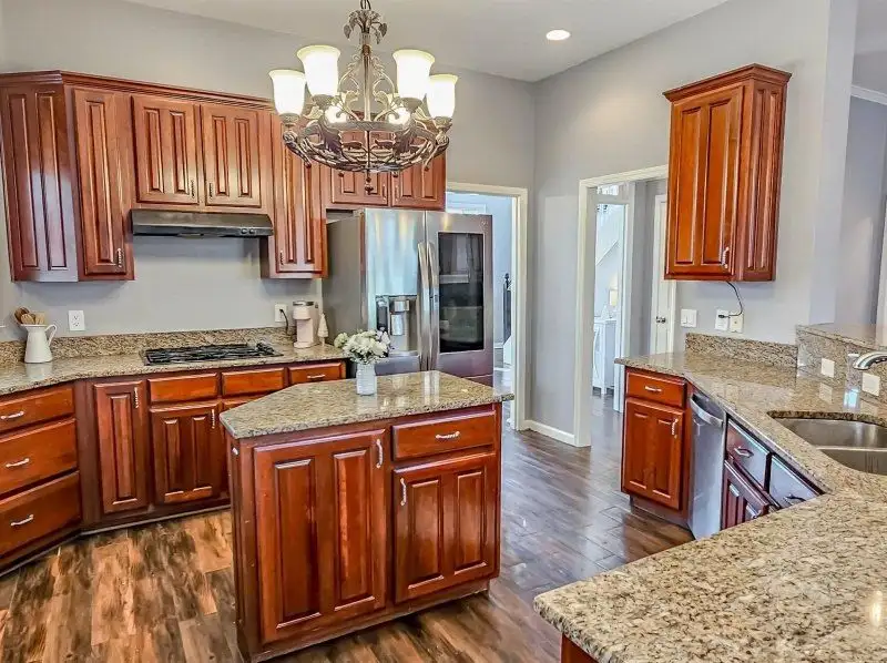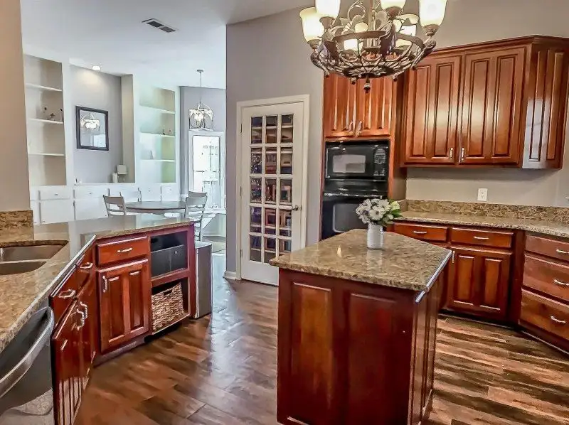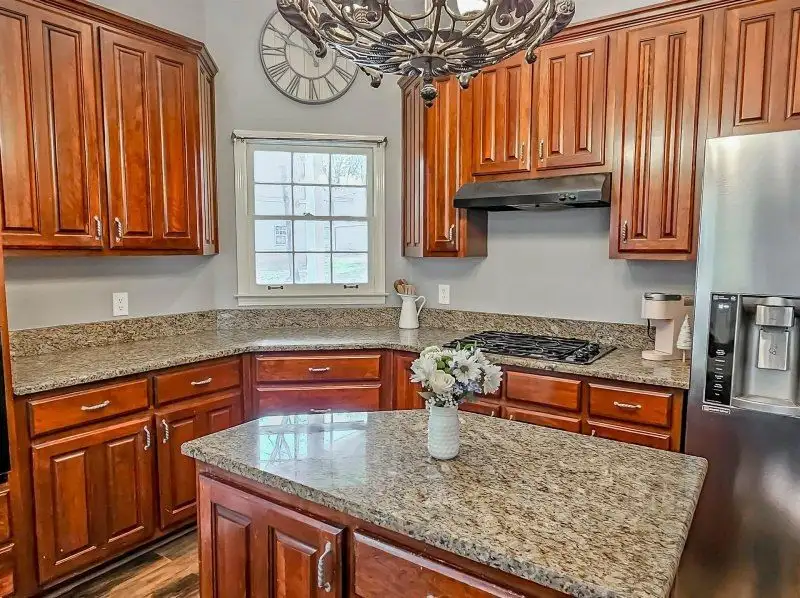 - Kitchen with granite counters and stainless steel appliances
