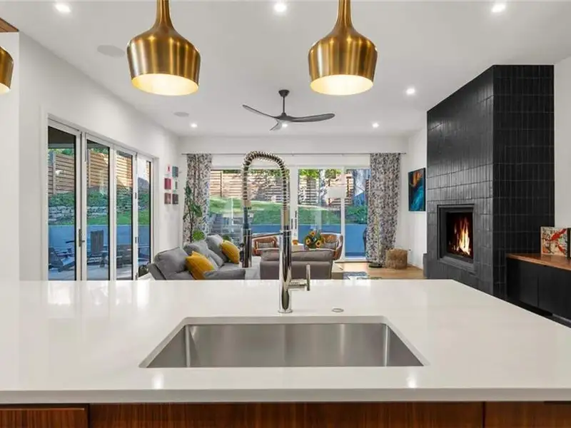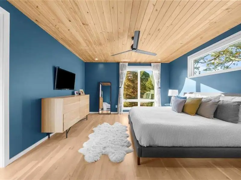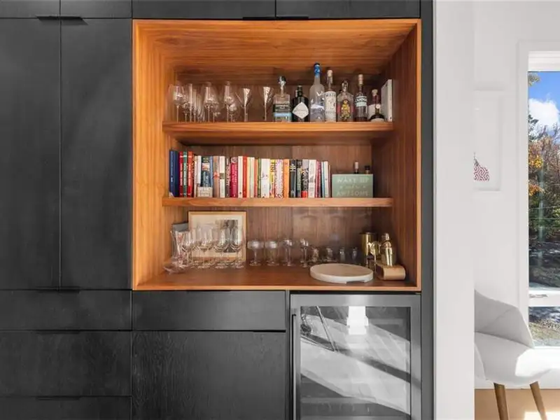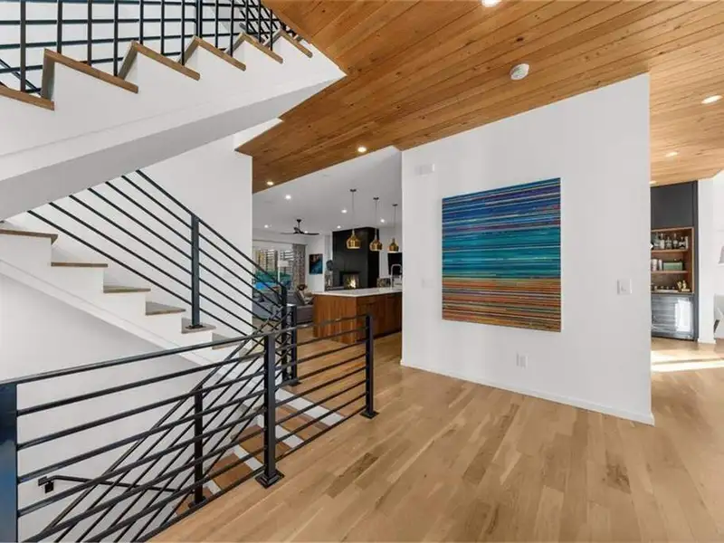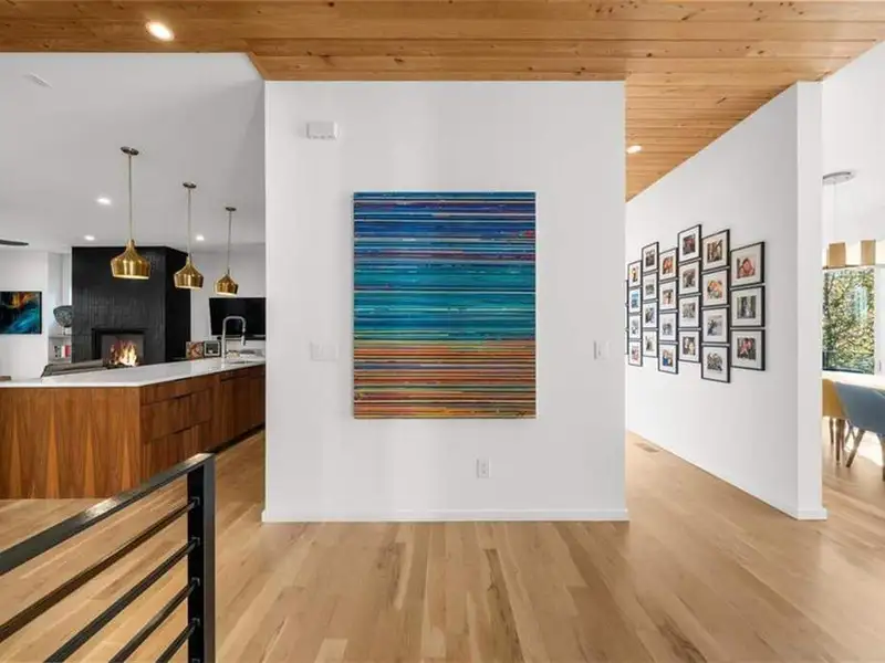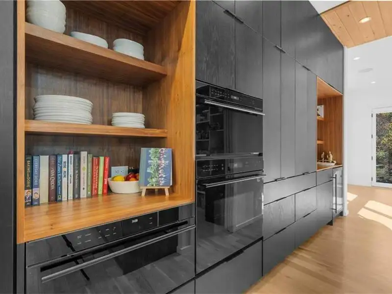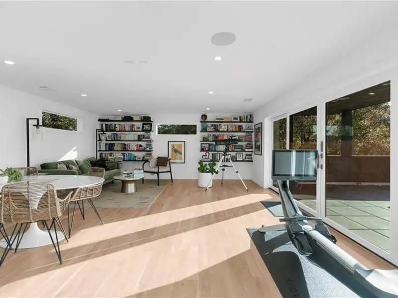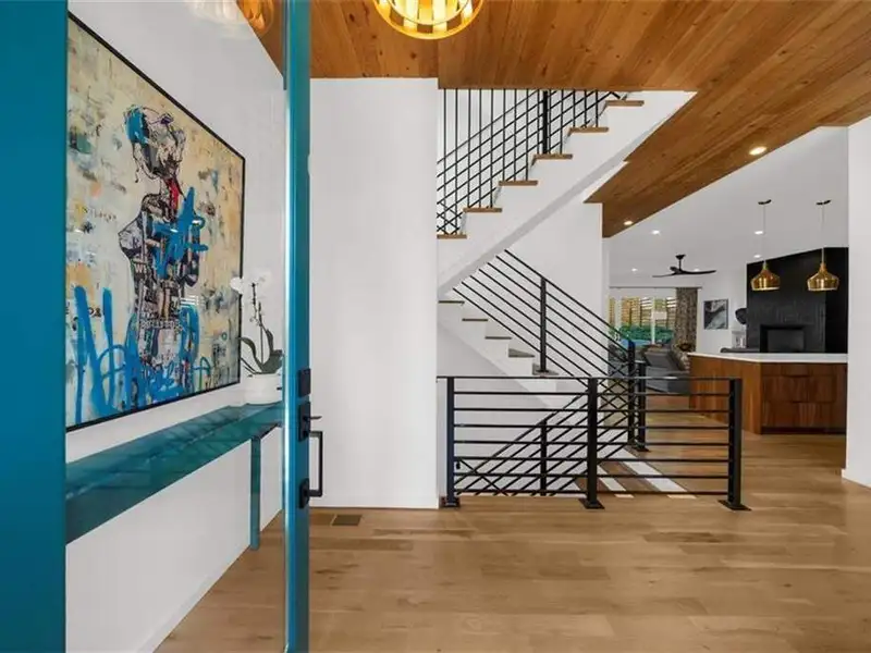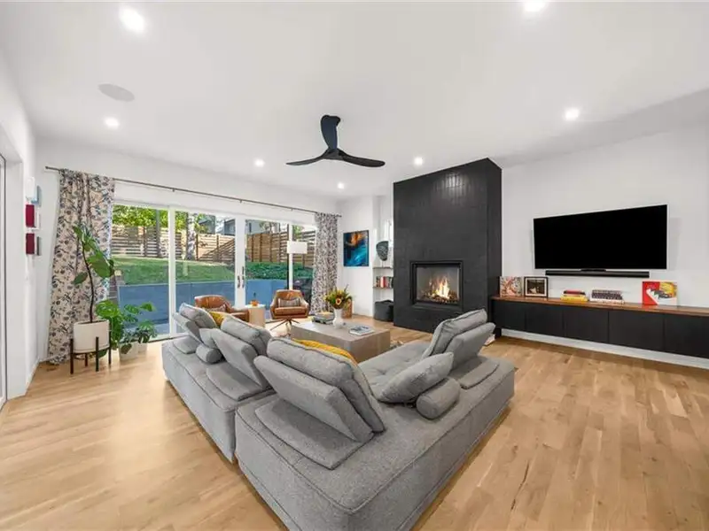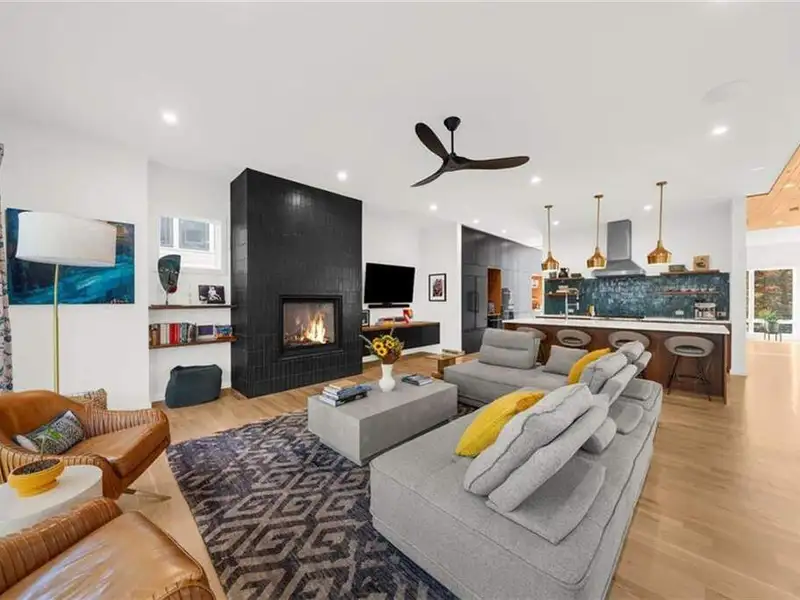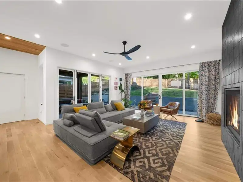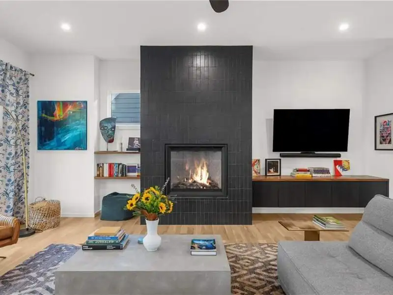- Floor-to-Ceiling Fireplace and Glass Doors