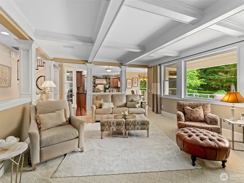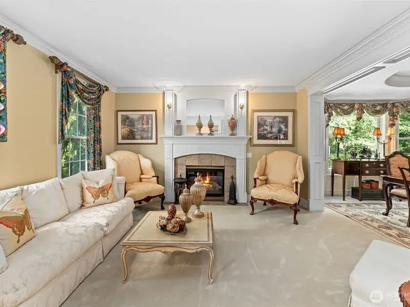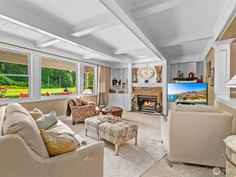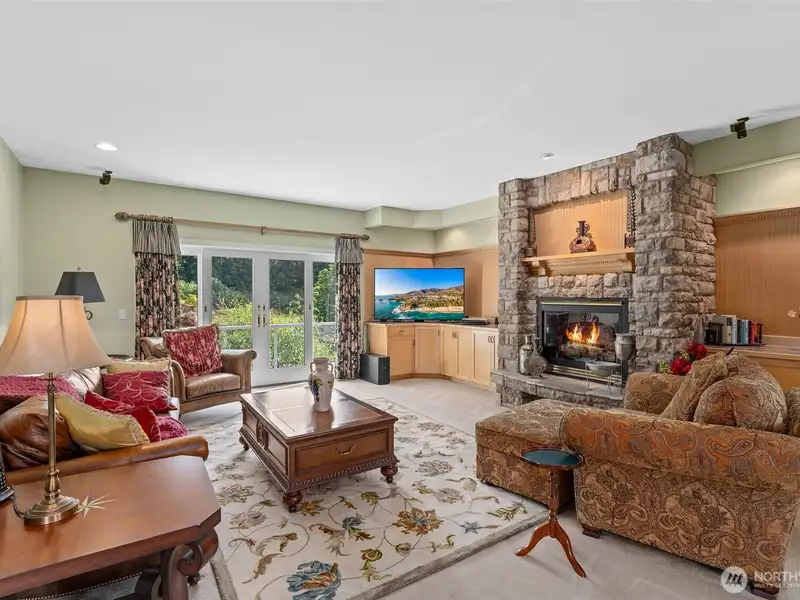 - Family room with stone fireplace and views