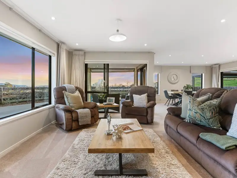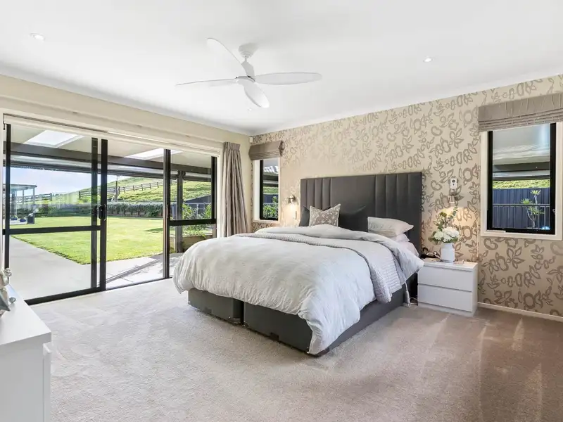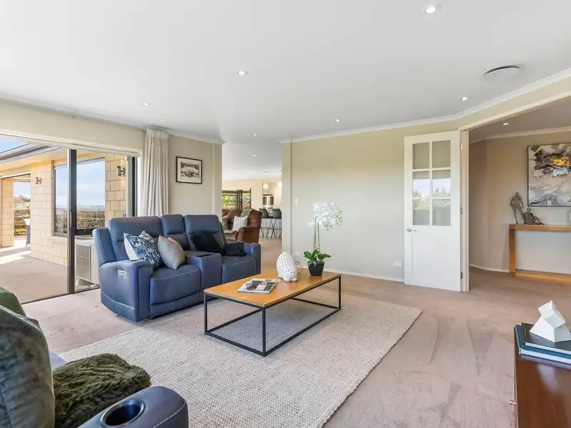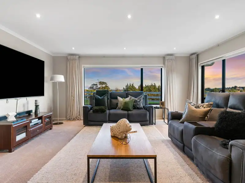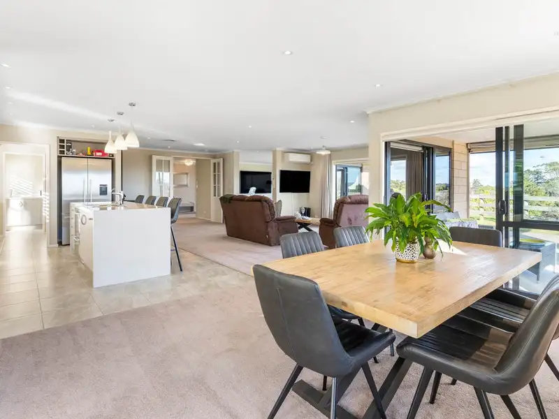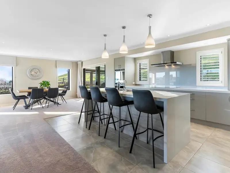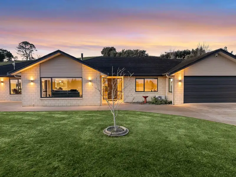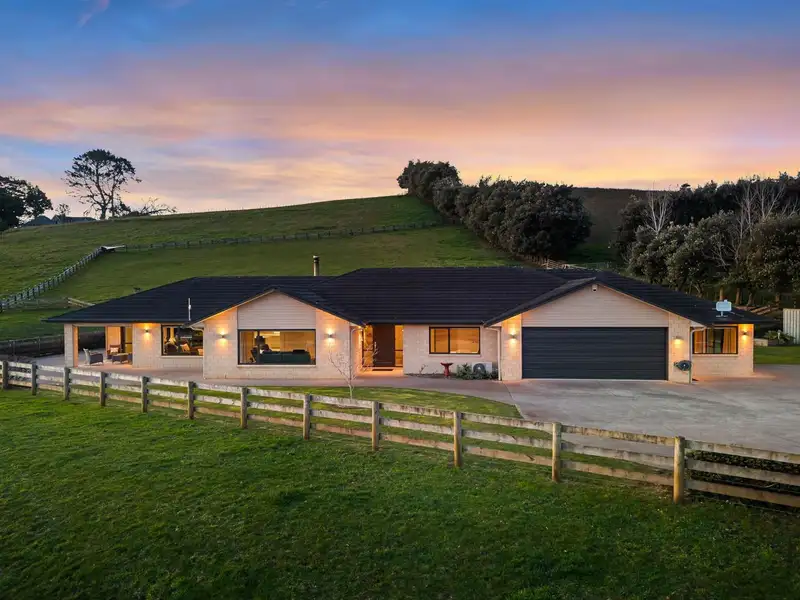 A long concrete driveway leads past the loading ramp and 130 square metre (approx) shed to expansive parking for myriad extra vehicles and entry to this 309 square metre (approx) brick with metal tile roof home completed in 2014 (CCC date). The property is located on 7975 square metres (1.97 acres) of land with distant views to Port Waikato. Double doors off the entry foyer access a stylish lounge room which flows into sun-drenched open plan family living with both heat pump and wood-burning fire, entered also from a second set of double doors in the foyer.