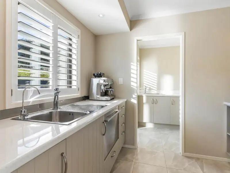 Sliding stacker doors spill out to scenic leisure and entertaining on two north-facing covered patios, one luxuriously equipped with café blinds and a large bubbling spa adjoining fully fenced fibreglass salt water pool with solar heating, pool robot and roller cover. There’s yet another covered al fresco area to enjoy off the dining and family rooms. Carpet morphs to large easy-care tiles in the streamlined dream kitchen with impressive cabinetry, engineered stone benchtops, quality appliances, island breakfast bar with pendant lighting and butler’s pantry with a second sink and dishwasher. Plantation shutters dress windows here while drapes adorn the spacious living areas.
