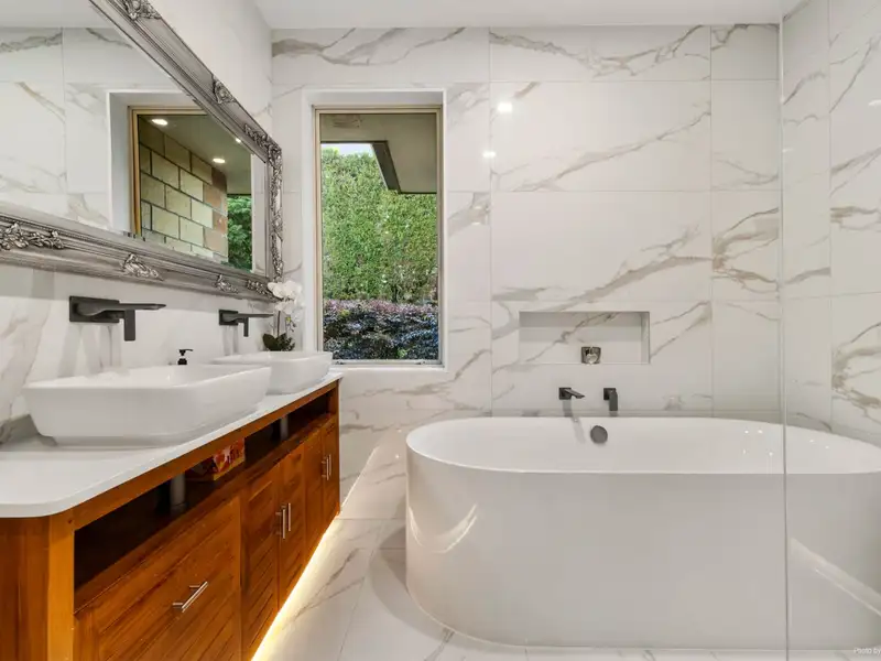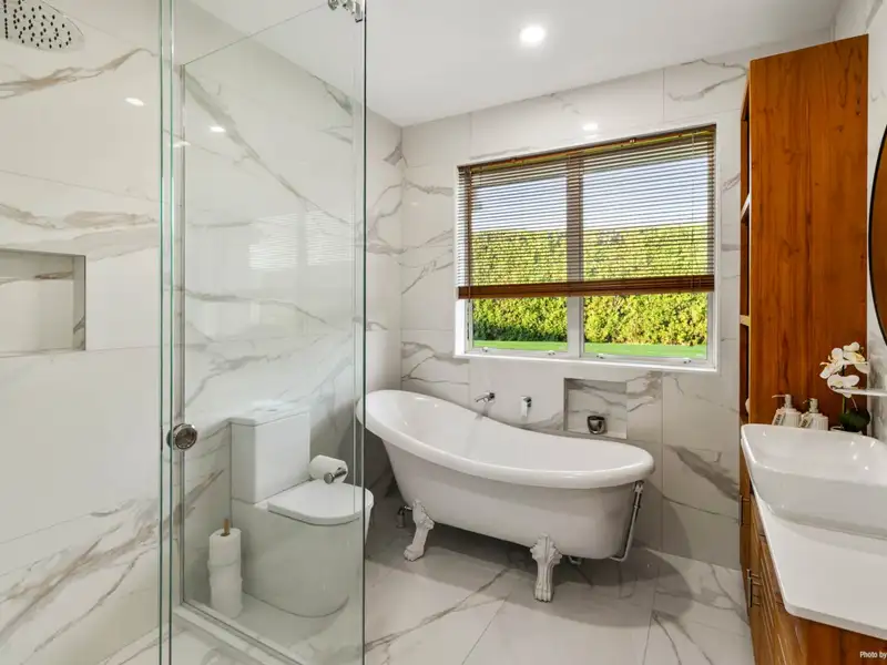 The home features five spacious bedrooms, four of which have walk-in wardrobes, including a standout master suite in its own private wing. The master offers a true retreat experience, complete with a custom-designed ensuite and separation from the main living zones. Bathrooms throughout the home are fitted with Caroma Urbane II tapware, and the family bathroom boasts a luxurious solid clawfoot bath.