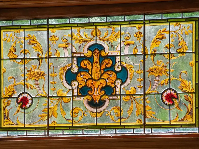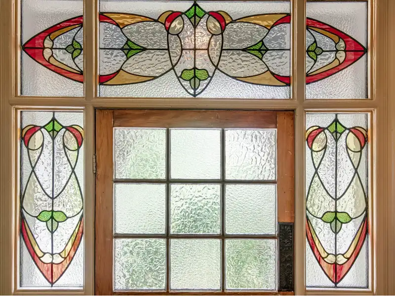 - Classic villa entrance with stained-glass surround