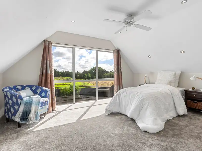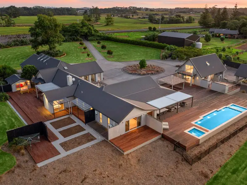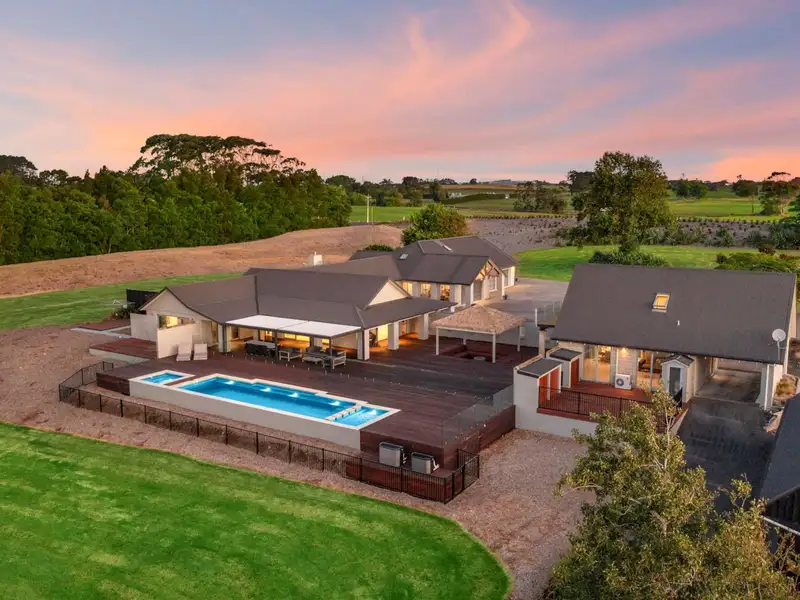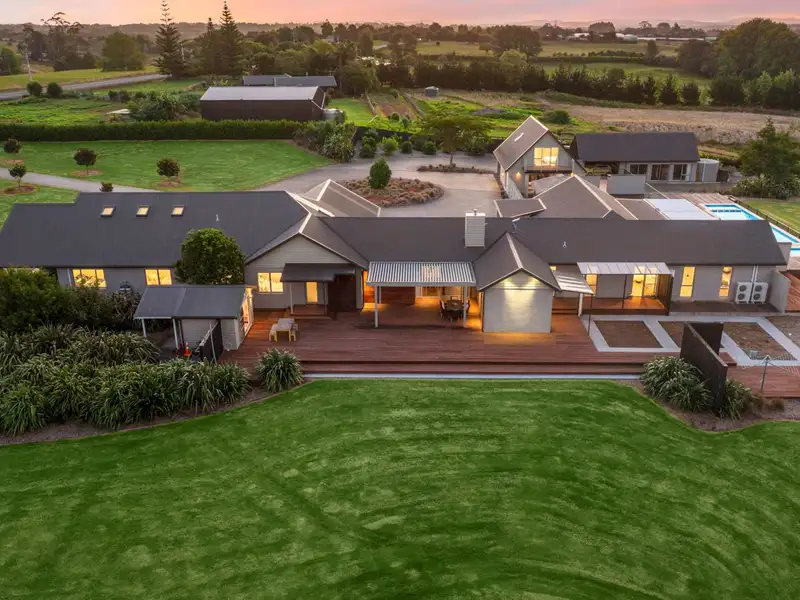 Located in the quiet Franklin community of Kingseat, neighbouring Karaka & Patumahoe village, no detail has been overlooked or expense spared in the creation of this magnificent north-facing solid masonry home of grand proportions and its additional independent living facilities. Set on 3.48 hectares/8.6 acres in a sought after locale and boasting fine fittings and fixtures, this huge premium quality 596 square metre (approx) residence incorporates six bedrooms comprising the sumptuous, privately positioned master bedroom with large walk-in robe, chic ensuite and access to two decks, scenic vistas and gentle evening breezes. The further five sunlit bedrooms, all with built-in wardrobes and tranquil views, share a bathroom with free-standing bath and shower.