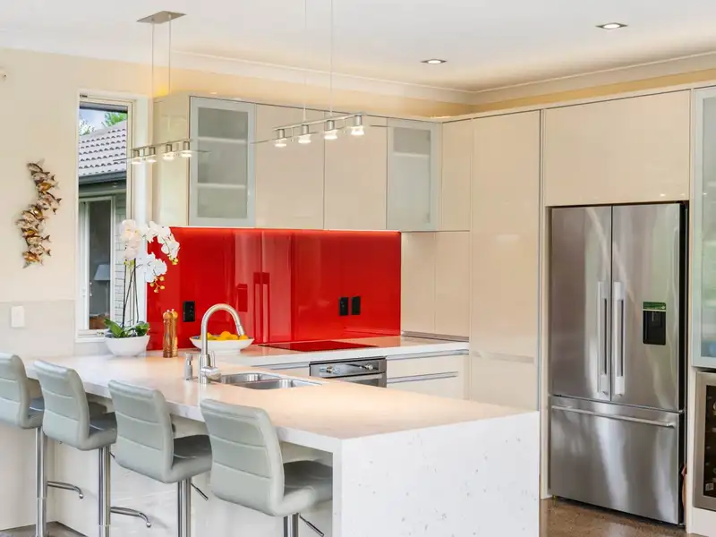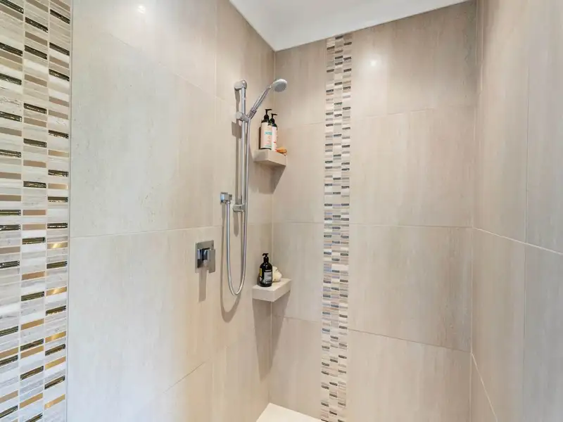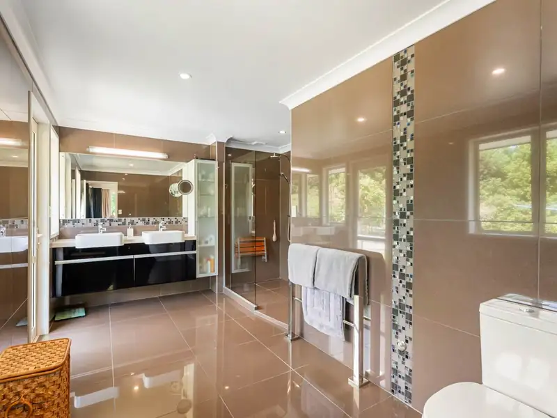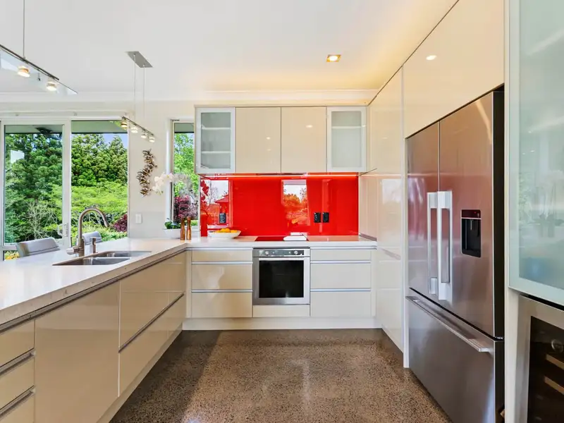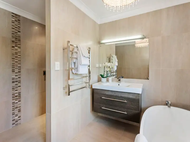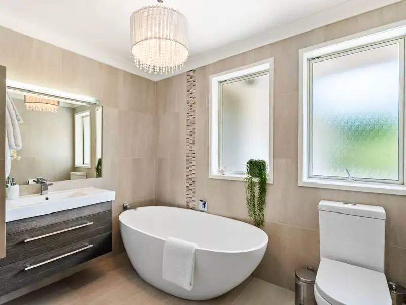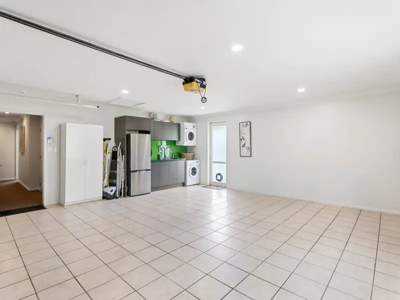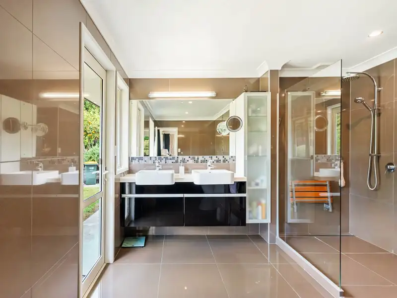 The home offers four generous bedrooms, including a super-spacious, air-conditioned master suite featuring a walk-in wardrobe, a glamorous floor-heated ensuite, and direct deck access. Three additional light-filled double bedrooms share a large family bathroom. Practicality meets luxury with two lock-up garages, one of which is a free-standing garage with versatile multi-use space and the other with internal access.