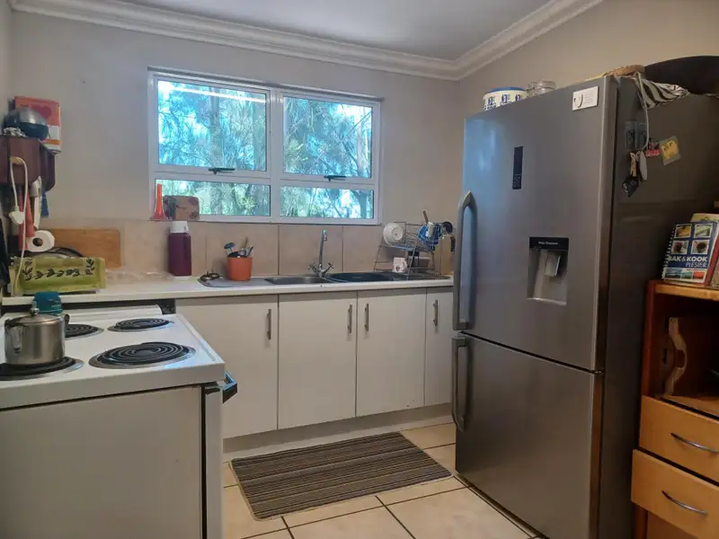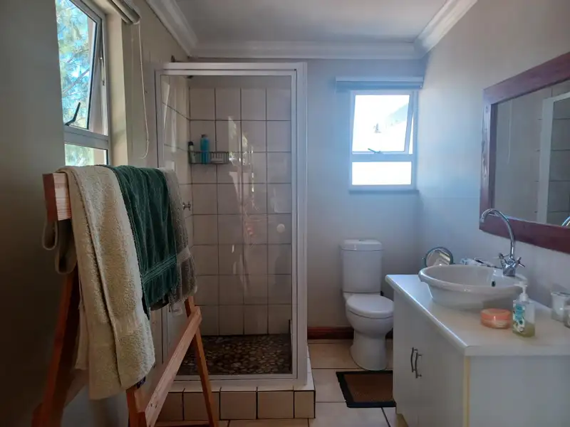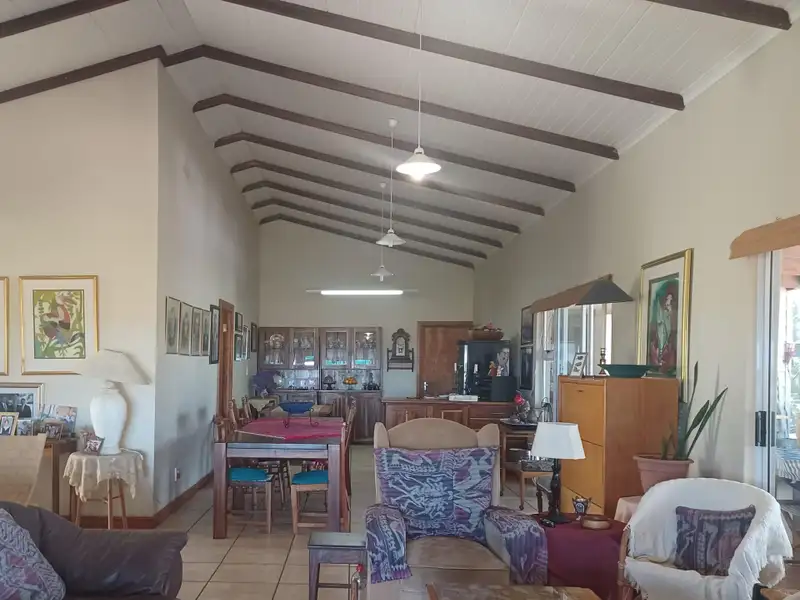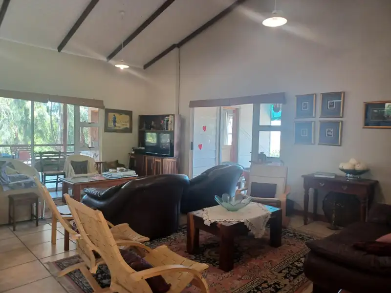 Primarily one enters from the stoep into the open lounge and dining areas which flows onto a spacious deck with a built-in braai, table and chairs for relaxed gatherings with family and friends and the guests and whoever knocks on the door. The functional kitchen is adjacent to keep the refreshments and food coming.