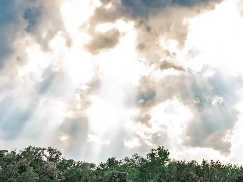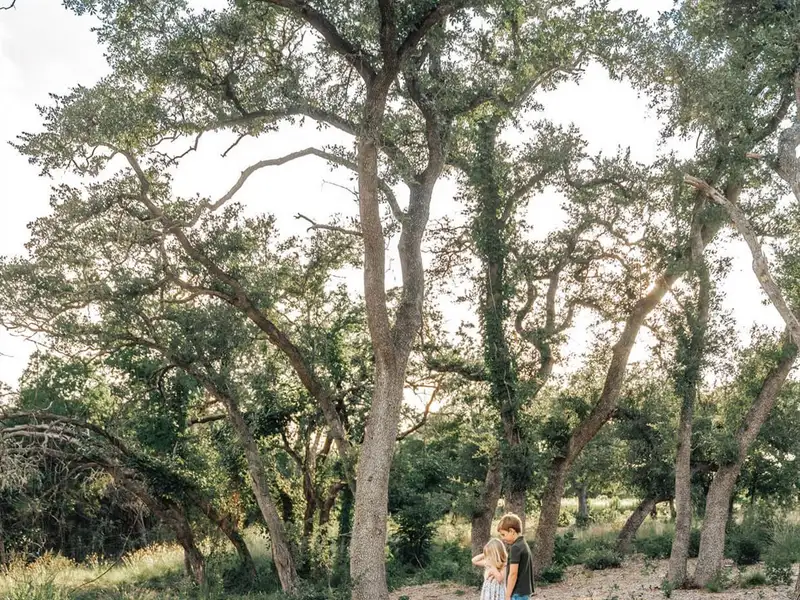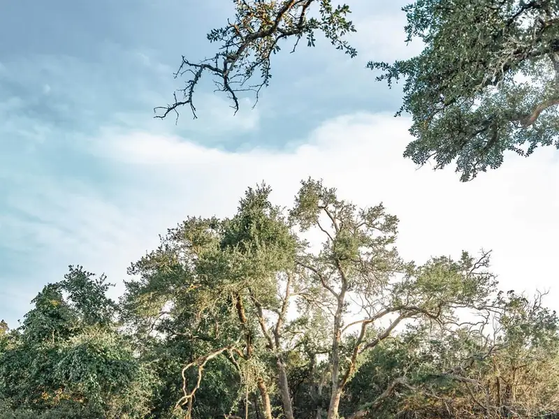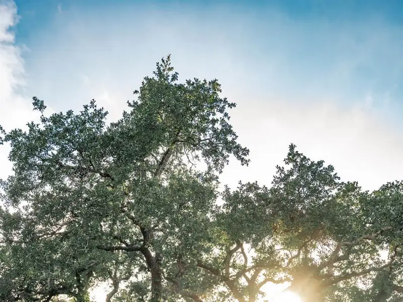 - Mature oak trees and lush vegetation