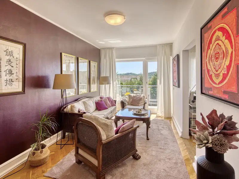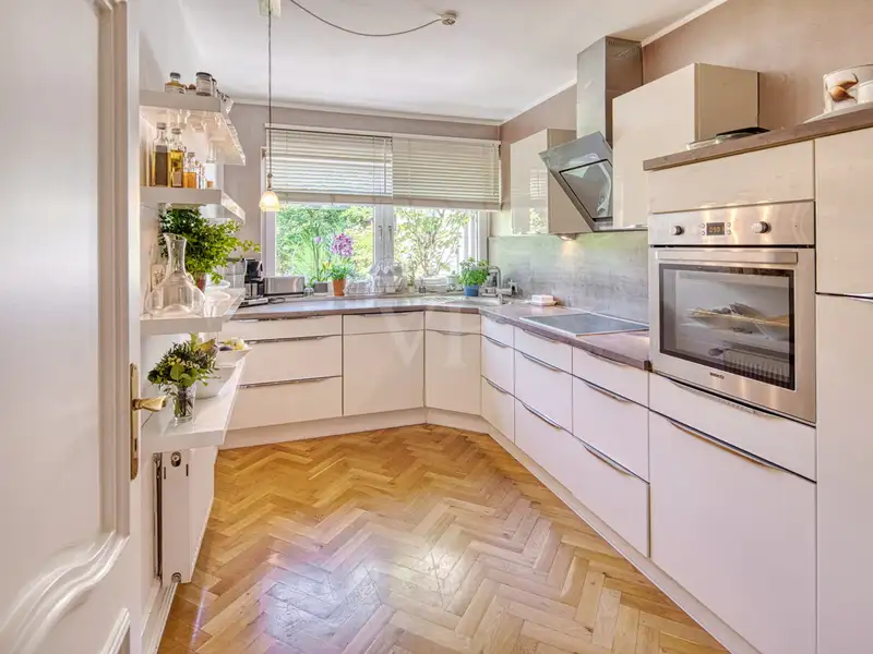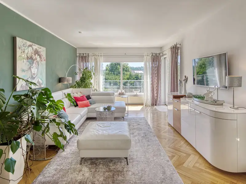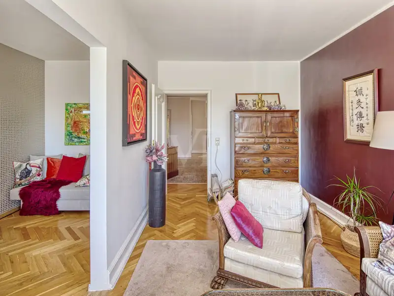 The entire apartment is fitted with elegant parquet flooring, which creates a warm and cozy atmosphere. The balcony, which runs along the living room and bedrooms, has large windows and guarantees a pleasant daylight ambience in all rooms. The furnishings meet a high standard of living, which is also reflected in details such as the elegant doors, modern sanitary elements and high-quality surfaces.