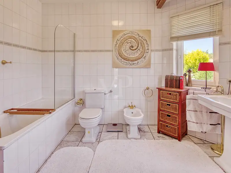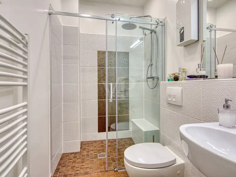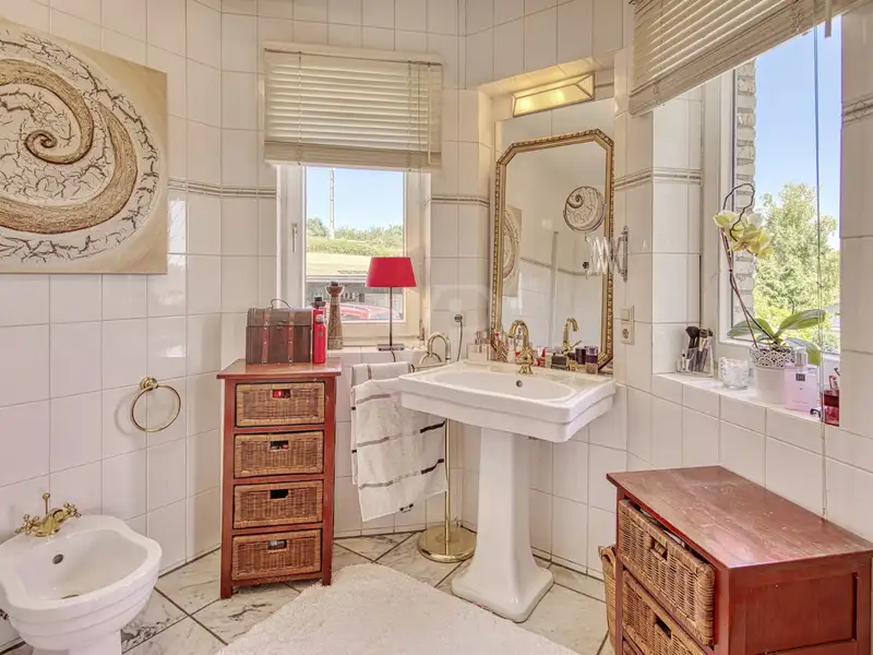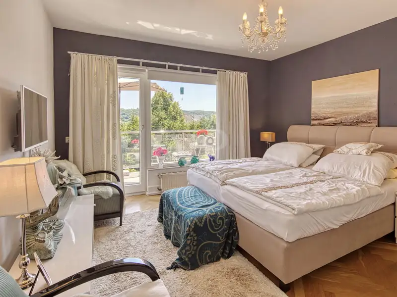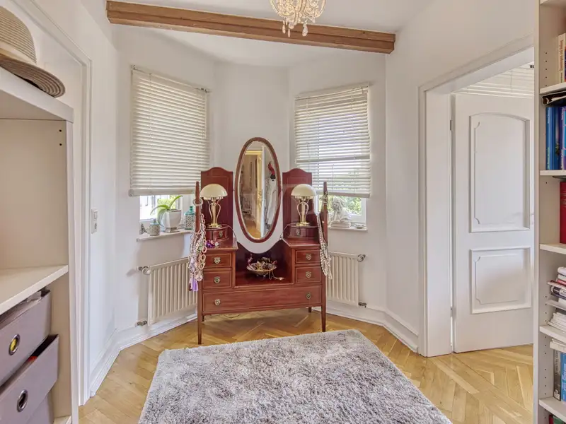- into a compact anteroom, through which you enter the modernized guest or children's bathroom with floor-level shower and the practical dressing room. From the dressing room, which you can furnish with bespoke wardrobe solutions, you can now reach the elegant main bathroom with high-quality fittings and bathtub. The dressing room also leads to the bright master bedroom with access to the balcony.