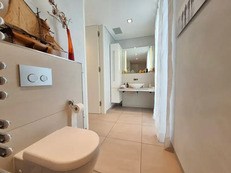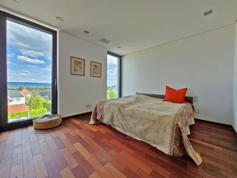 The house itself is a place of peace and comfort. With underfloor heating, an efficient heat pump and the highest quality materials, a space has been created here that offers a pleasant climate all year round. The private retreat area is located on the upper floor: two bedrooms, a dressing room and a luxurious master bathroom in the middle, which invites you to dream with a free-standing bathtub, rain shower and access to the balcony.