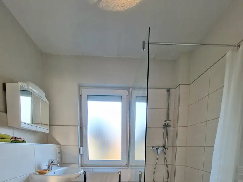 The house has a total of five rooms, three of which can be used as bedrooms. These offer enough space for the whole family spread over two floors. An intercom and door opening system for both apartments provides the necessary convenience. Two bright and modern bathrooms with a walk-in shower, washbasin and WC and underfloor heating (ground floor) ensure a feeling of well-being. The bathroom and WC on the top floor are separate from each other. All windows are fitted with shutters, some of which are electric. The apartments can be used individually, but it is also possible to use the entire property.
