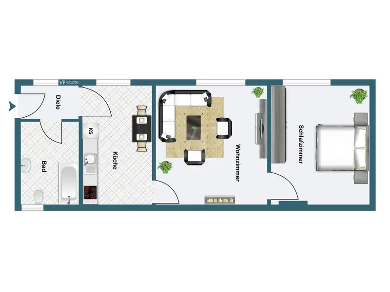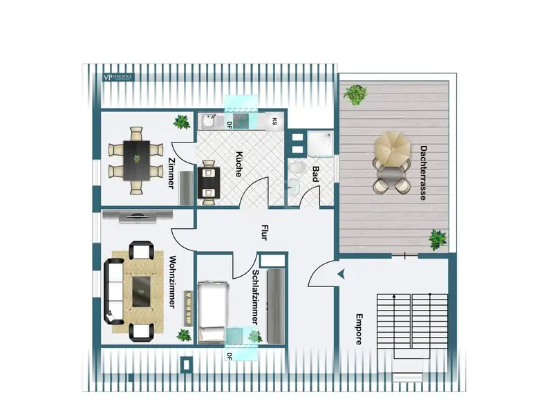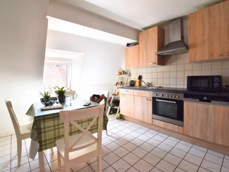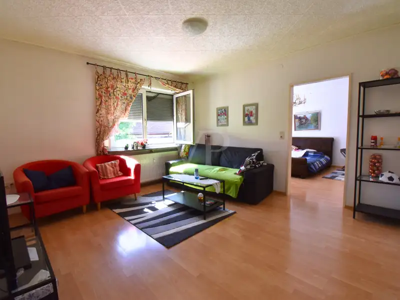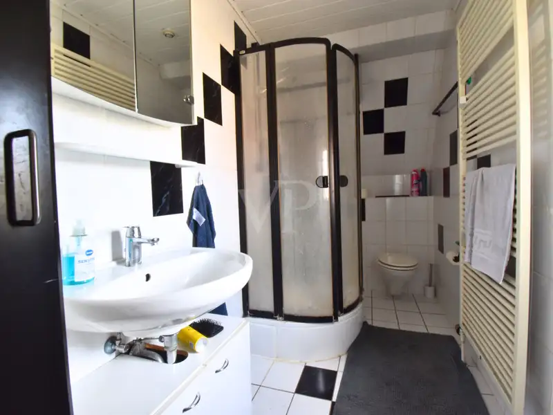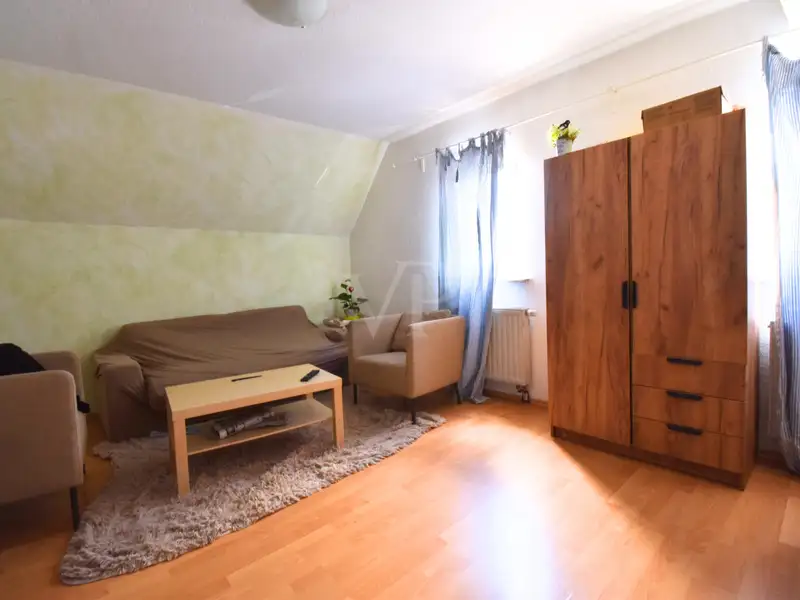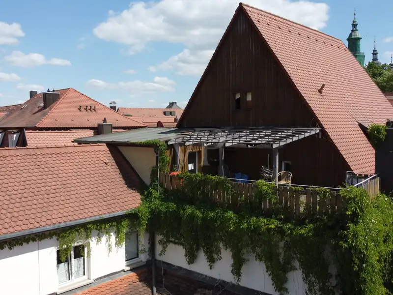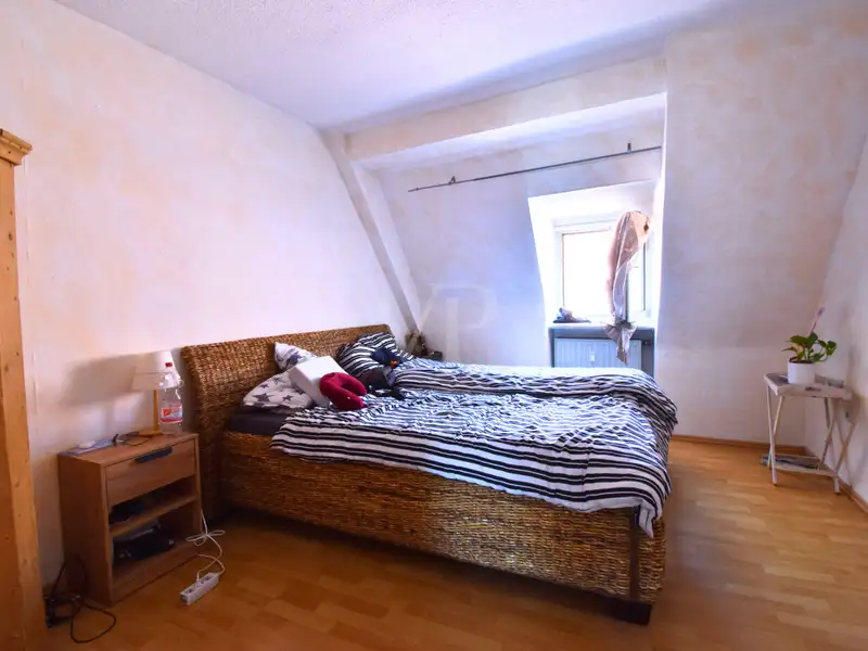 Another highlight awaits you on the top floor: a 3-room apartment measuring around 80 m² with an attractive roof terrace and magnificent views over Bad Windsheim. This unit is also currently rented out. Thanks to the steep pitch of the roof and the high kneeling floor, there are almost fully usable rooms here without any annoying sloping ceilings.