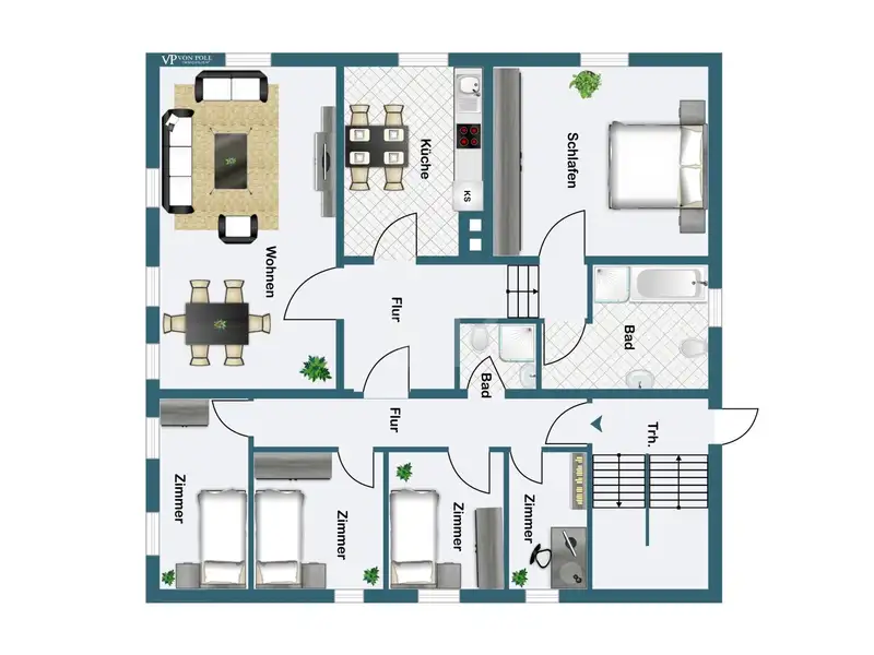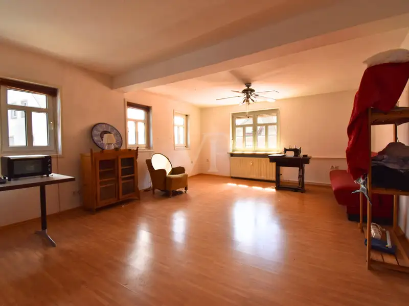 The residential building is accessed via a separate staircase and boasts three residential units. On the upper floor, on the right-hand side, you will find a currently well-let 2-room apartment with around 50 m² of living space. On the opposite side is a spacious, approx. 130 m², 7-room apartment. Here you have the chance to combine historical charm with modern accents - the perfect basis for sophisticated living with plenty of space for free development. All apartments have double-glazed plastic windows and are well maintained.