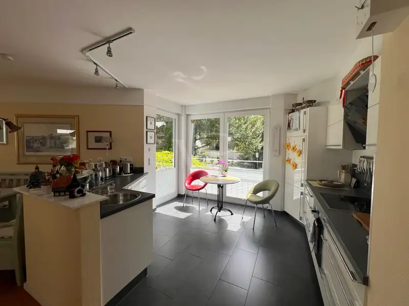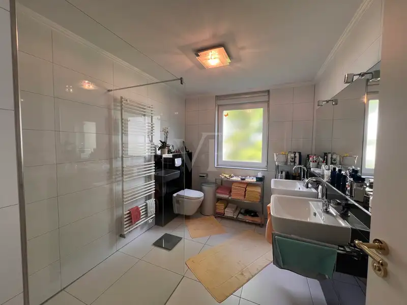 The fitted kitchen with high-quality built-in appliances is discreetly integrated into the living area and meets modern standards of comfort and design. The daylight bathroom impresses with its spaciousness and functionality: a floor-level shower, a double washbasin and stylish ceramics create a pleasant atmosphere. There is also a separate guest WC.