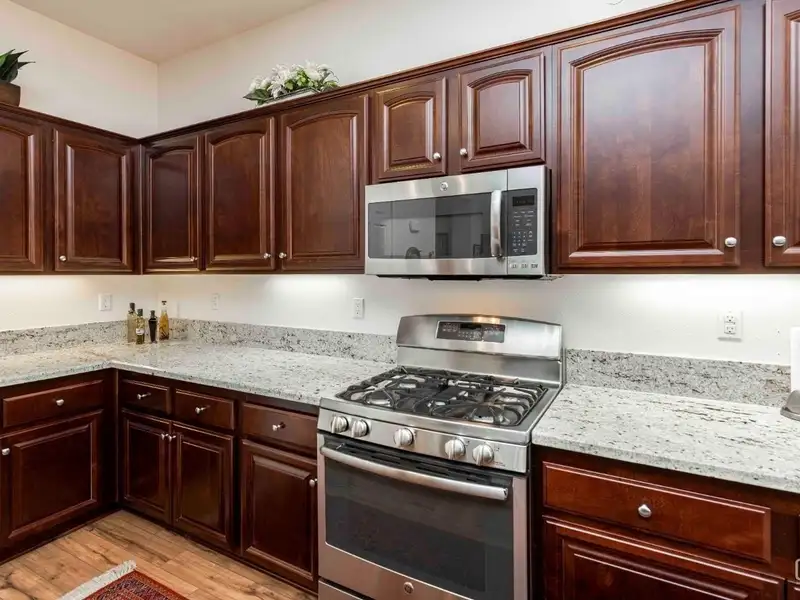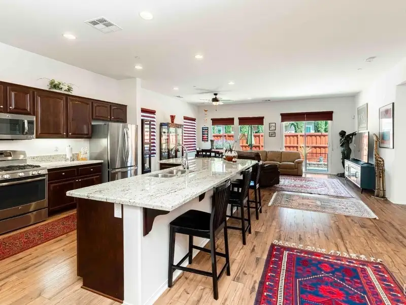 - Kitchen with granite countertops and island