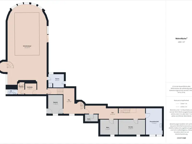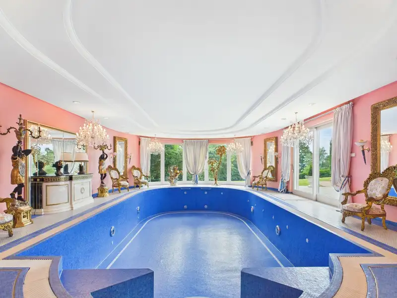 A special highlight is the wellness area with approx. 150 m²: a stylish indoor swimming pool with a 5 × 10 m pool, changing and shower areas, a high-quality sauna and an open-air seating area. Elegant glass mosaics and atmospheric lighting concepts create a luxurious atmosphere.