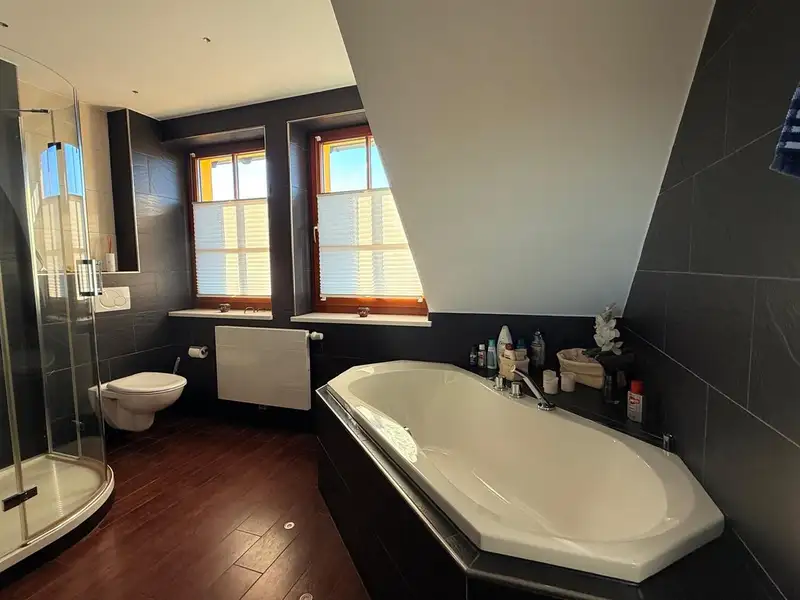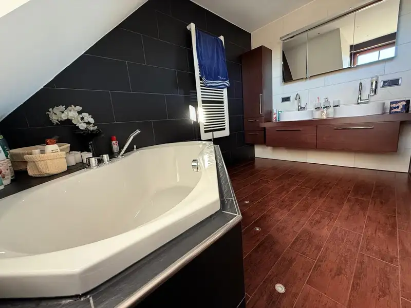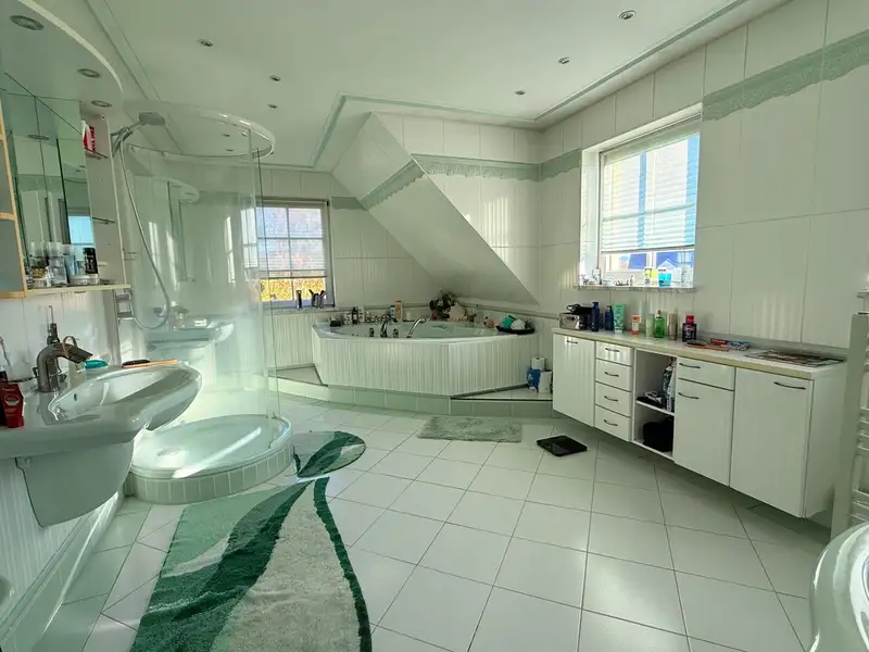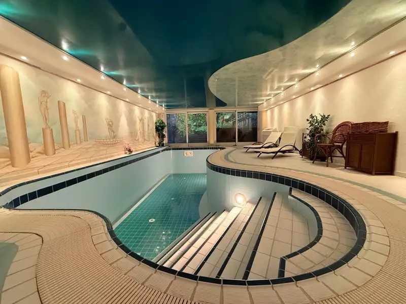 Another feature is the indoor pool (approx. 7 m long) with counter-current system, which allows you to enjoy wellness moments within your own four walls. The offer is complemented by a wet sauna with shower.