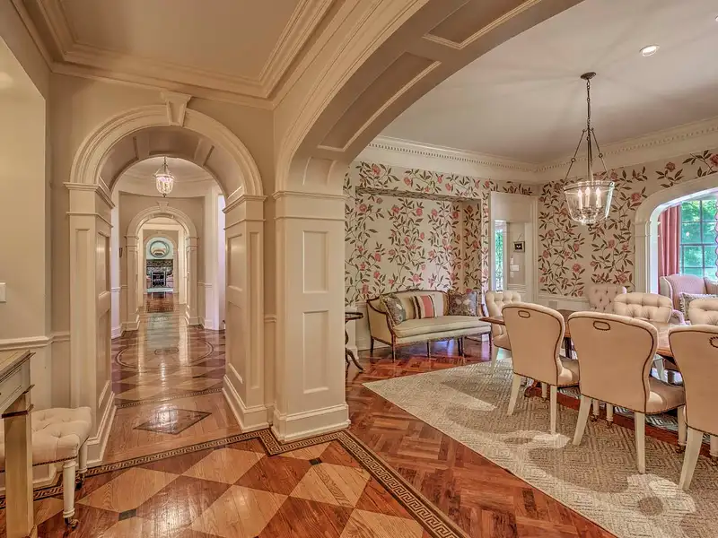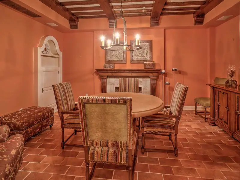 Classic design elements within the layout include seven intricately mantled fireplaces, oak wood floors, arched doorways, traditional moldings and woodwork, stunning architectural details, unique built-ins, custom-painted rooms, exposed ceiling beams, two wet bars, a rear staircase and covered porte-cochère access to the home's three-car garage. Hiland Hall Turner Architects oriented the residence on the acreage to take advantage of morning sunlight in the front rooms and colorful sunsets in rear-facing spaces.