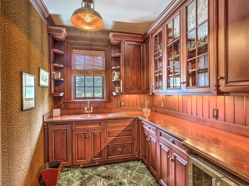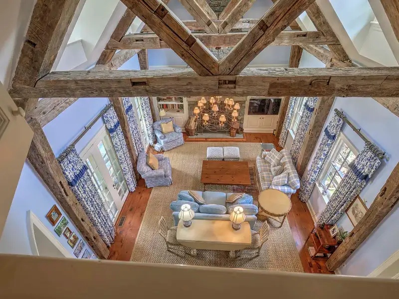 The epicurean kitchen presents a center island with a prep sink, Franke farmhouse sink, custom cabinetry and a sun-splashed dining area with a domed ceiling featuring a hand-painted cloud mural. A collection of high-end appliances includes a Viking range, Sub-Zero refrigerator, Bosch dishwasher and wine refrigerator. Adjacent to the kitchen is a secondary office space and a butler's pantry. The floor plan continues into a great room set under towering vaulted ceilings accented by reclaimed wood beams. Natural light spills into this space from fixed upper windows and French doors to the porch, while a floor-to-ceiling stone fireplace is a handsome focal point. This part of the home is completed by a mudroom with storage options, informal powder room, staircase to the finished lower level, secondary stairs to the bedroom level, and access to the porte-cochère and garage.