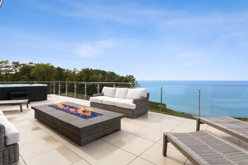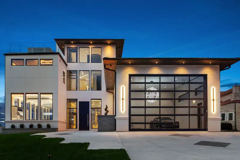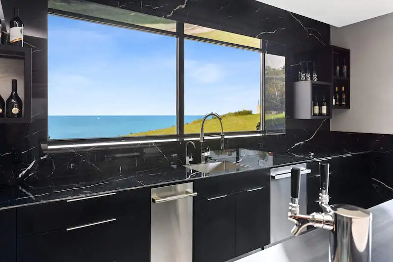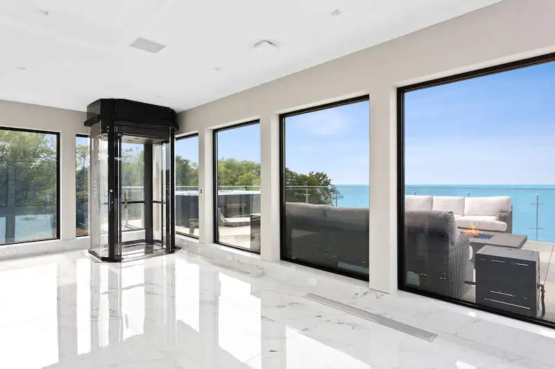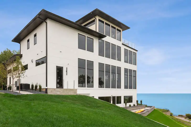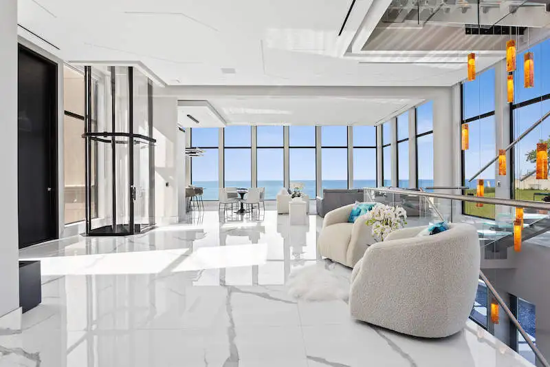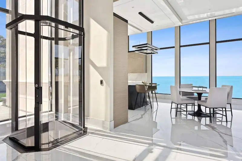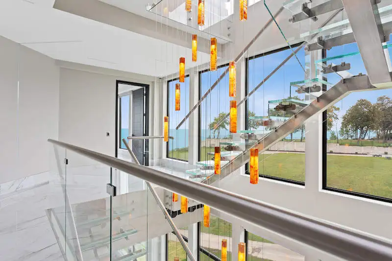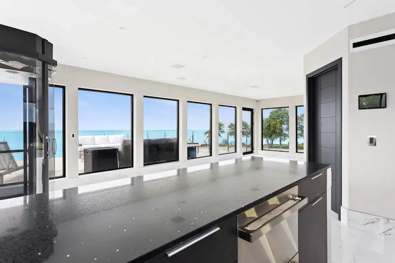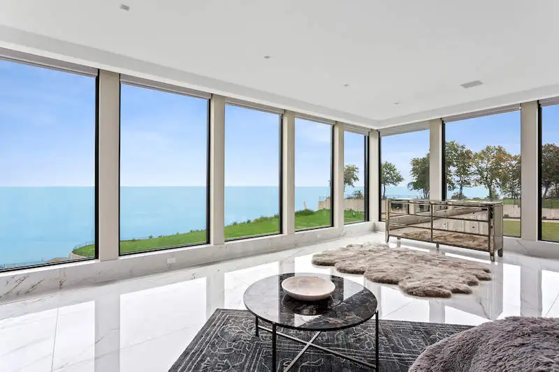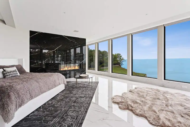 Modern home with 8,000 SF of dramatic spaces that focus on clean lines, sleek surfaces & panoramic Lake Michigan views. 4 levels with floor to ceiling windows & heated Marble floors. Impressive custom glass staircase paired with glass elevator for access to all levels. Featuring breathtaking chefs' kitchen with 2021 Jennair & sub-zero appliances & beautiful White quartz countertops. Impressive Primary suite with incredible lake views gorgeous Marble fireplace, wrap around windows with sitting area. Striking ensuite with Marble walk in spa shower & custom soaking tub handmade in Italy. 3 large guest suites. Roof top deck with hot tub. Lower-level home theater with advanced viewing screen/audio system. Bar with humidor, custom wine cellar, light up onyx bar & kegerator.