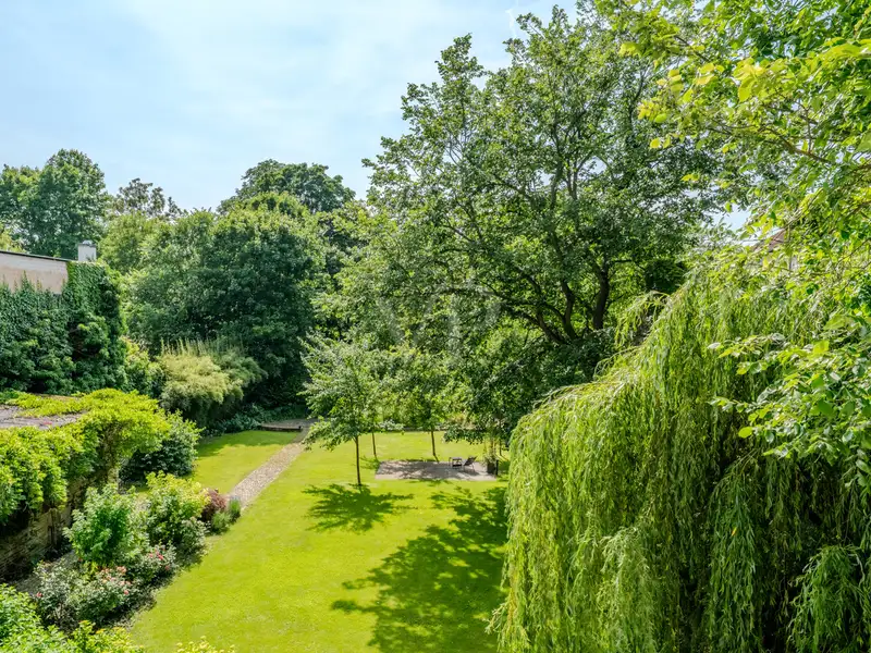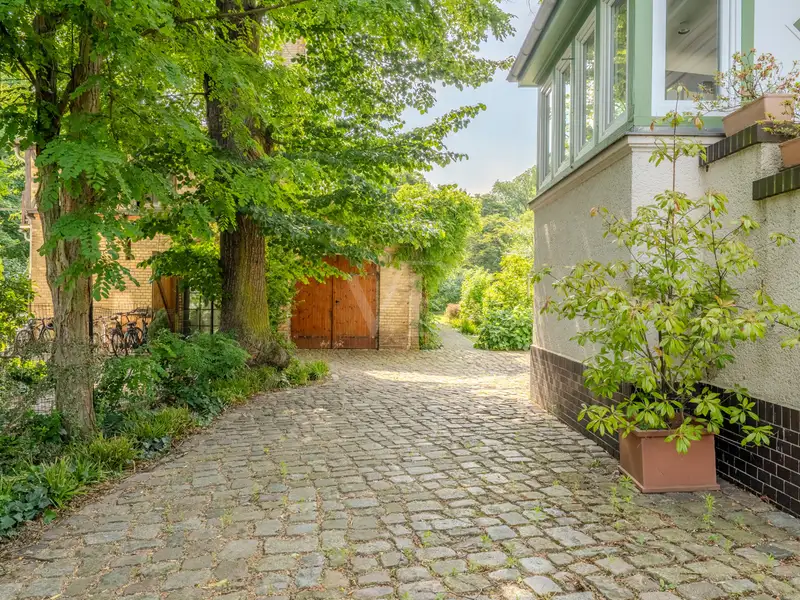 In addition to the unique Pankow location, the property, which is over 1300 m² in size, has a lot more to offer. The garden, which was designed by a garden architecture firm, allows you to forget the stress of everyday life and the bustling city. The adjoining park-like embassy property of the Republic of Togo guarantees an unobstructed view of the greenery. The neighboring buildings allow for further development on the rear part of the property, thus opening up space for additional possible uses. Including an old coach house for a studio or guest house, for example.