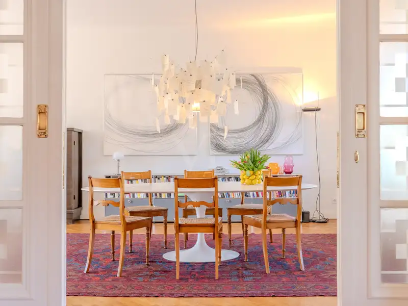 This charming beauty, a classic Pankow villa in a special architectural style, combines timeless elegance and historical charm on around 225 m² of living space. Seven spacious rooms, a large hallway, a cozy kitchen as well as three bathrooms and a guest WC offer a comfortable home with historical flair. Formerly used as an embassy residence, the villa has been lovingly renovated and converted over several stages. In the last modernization phase in 2018, the bathrooms and living areas were brought up to a modern standard, taking into account the historical features.