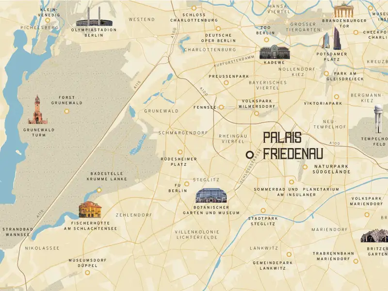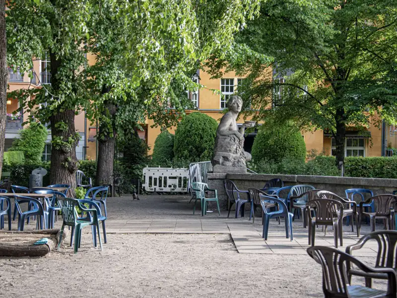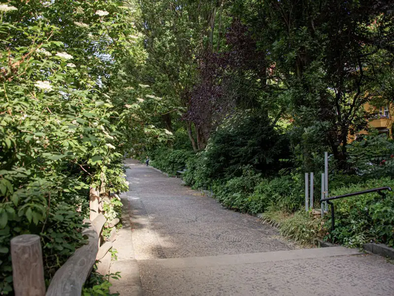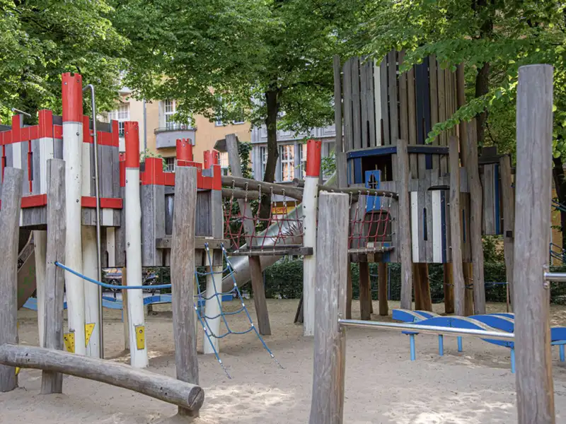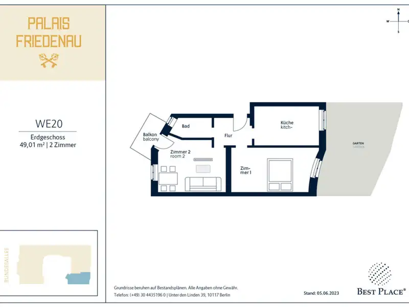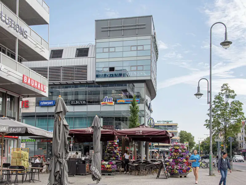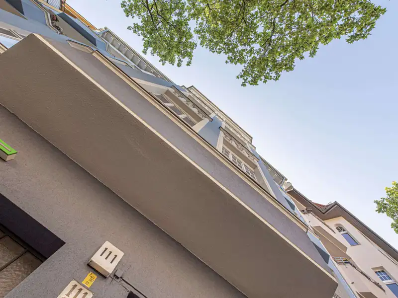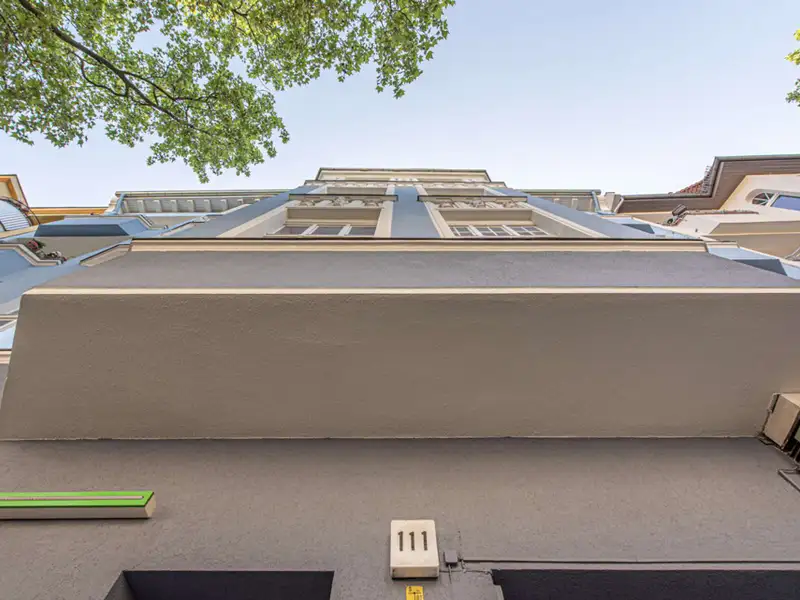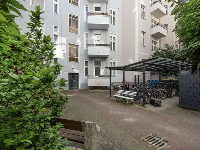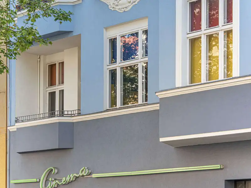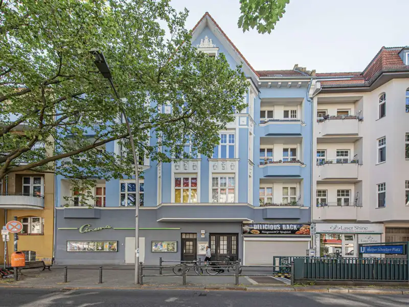 The stately Gründerzeit building Palais Friedenau at Bundesallee 111 was built in 1900 and blends harmoniously with the surrounding Wilhelminian architecture with its sky-blue façade. The property consists of a front building, side wing and rear building, extends over four floors and houses two commercial units and 21 flats. The flats offer 2 to 4 rooms with sizes ranging from approx. 41 to 121 m² and are mostly rented. They are accessed via staircases and some units have balconies facing the quiet backyard. The enclosed, well-kept inner courtyard offers sheltered bicycle parking and is harmoniously designed with benches and plant beds. The ground floor also houses the "Cinema" cinema with its characteristic green neon sign.