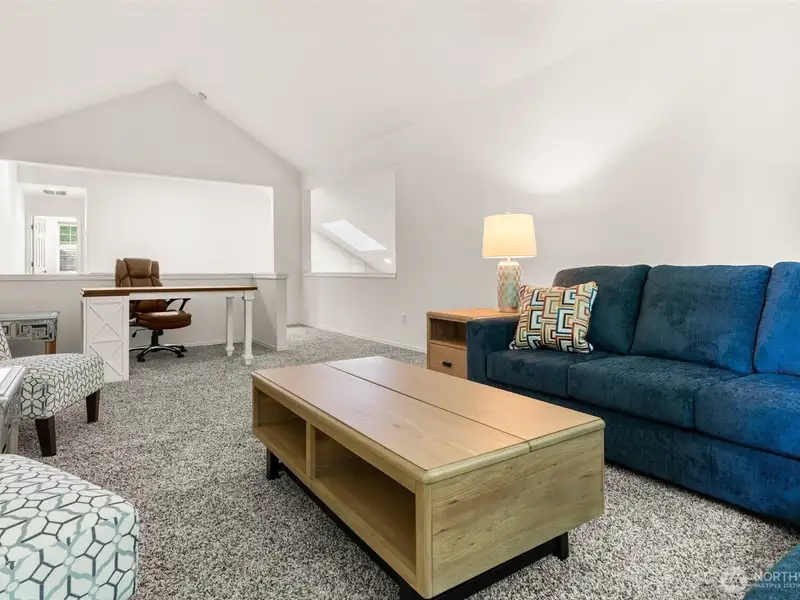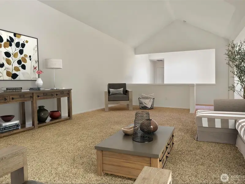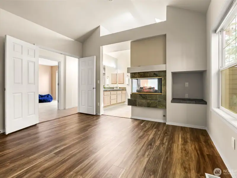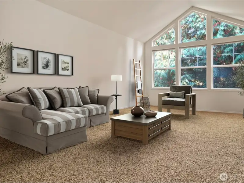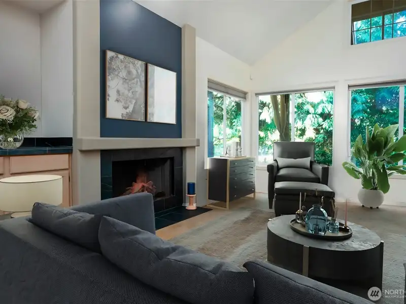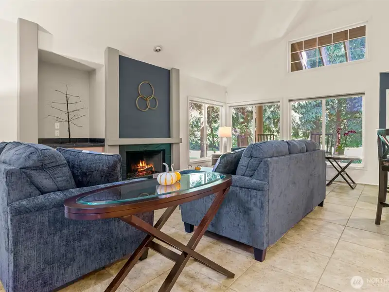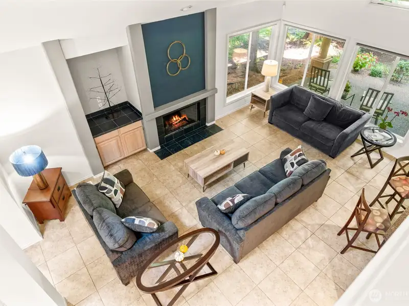 - Vaulted ceilings with grand fireplace