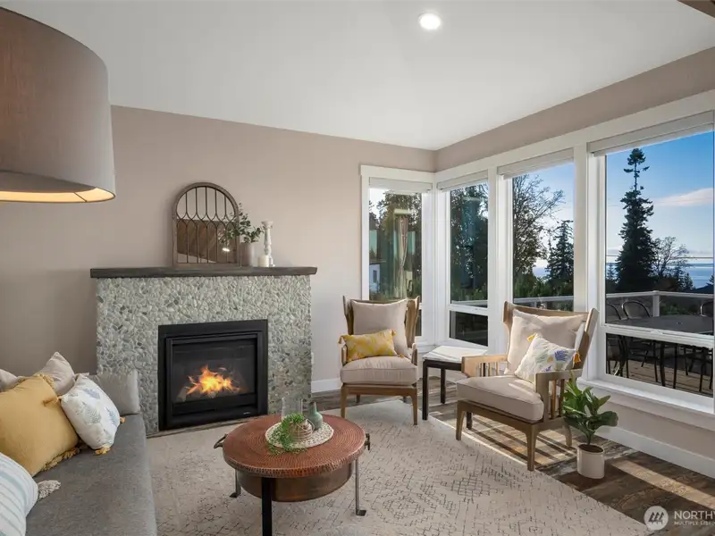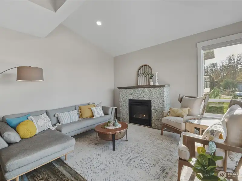 - Vaulted ceilings with gas rock fireplace