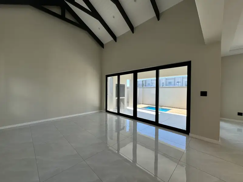 The double garage, equipped with a quick-opening motor and weather-resistant seals, accommodates larger vehicles with a 2.4-meter-high door, plus two additional outdoor parking bays. A low-maintenance garden surrounds the decked splash pool, complete with a built-in braai for ideal outdoor entertaining.