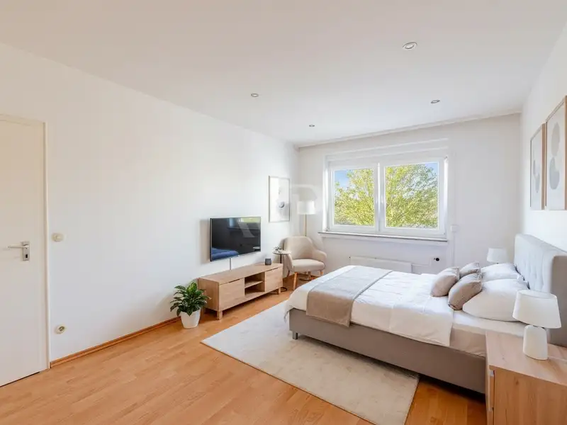 The space on offer extends over a total of four rooms, including two spacious bedrooms and a generously proportioned living room. Large windows ensure that the rooms are pleasantly flooded with light and create a friendly atmosphere. The bathroom impresses with its functionality and offers sufficient space for daily routines. A separate kitchen rounds off the offer and has potential for individual design.