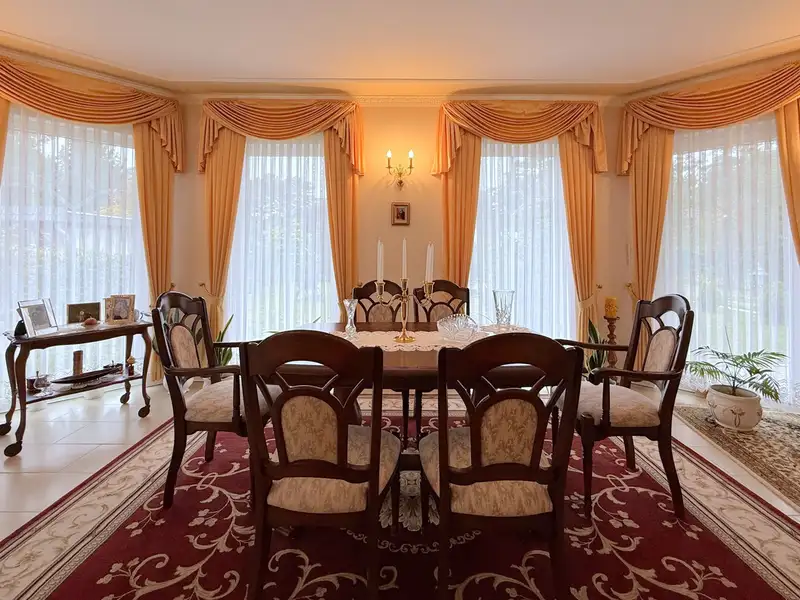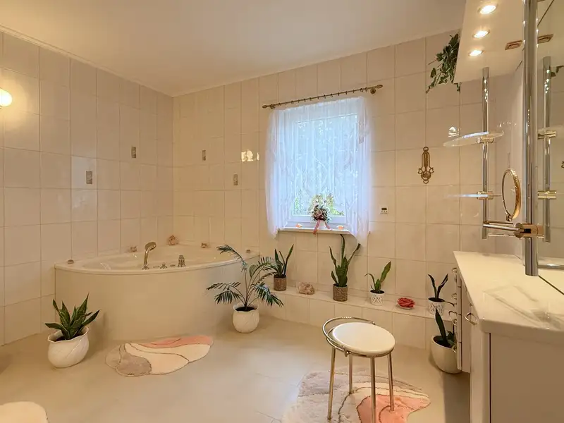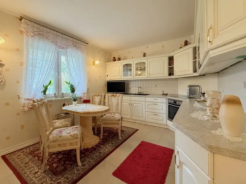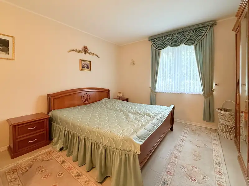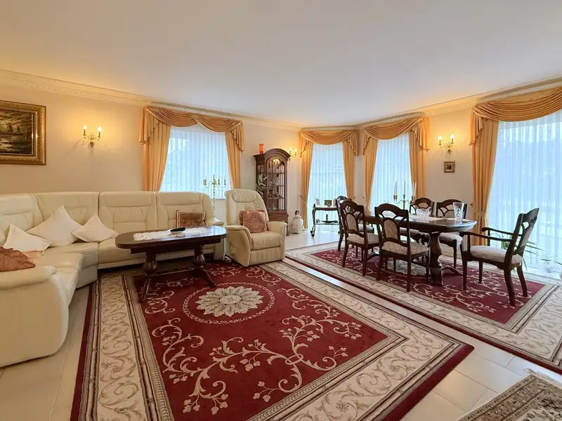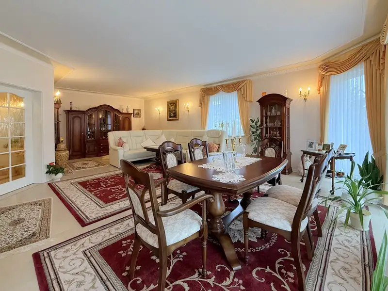 Technically, the house is of a high standard. Underfloor heating in all rooms, double-glazed windows, modern gas central heating with an underground liquid gas tank and a solar system for heating water ensure efficient and comfortable living. The garage is very spacious and has a goods elevator to the underground passageway and a boiler room with integrated workshop.