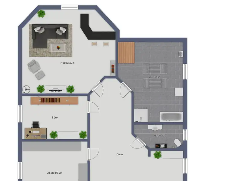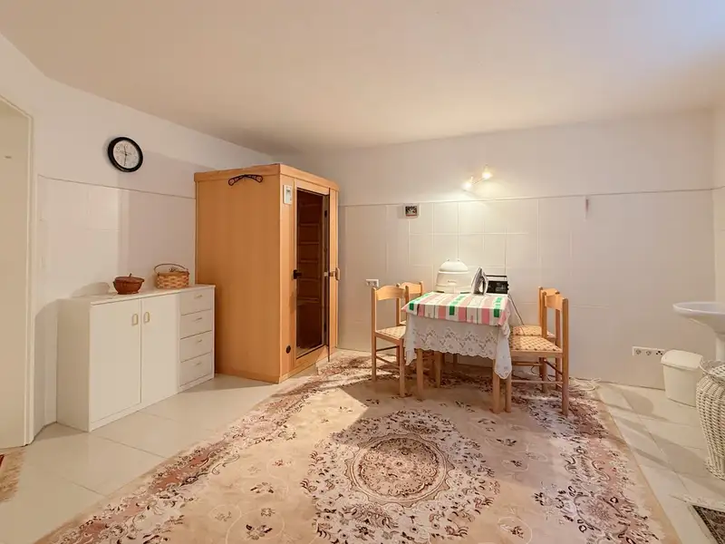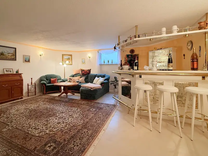The basement extends the living space and offers plenty of room. The wellness area with sauna, shower and bathtub creates space for relaxation, while the spacious hobby room with bar, drinks cooler and beer dispenser becomes a social hub. The basement is completed by a study, a storage room, a further WC and the unique underground access to the garage - an architectural detail that perfectly combines comfort and weather protection.