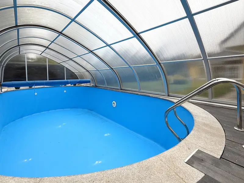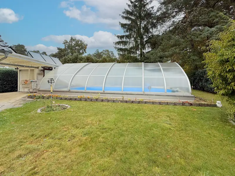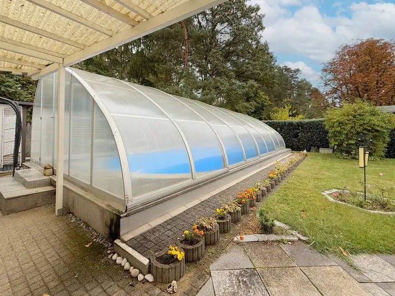 The outdoor area has been lovingly designed and blends harmoniously into the overall picture. The covered terrace offers a beautiful view of the well-tended front garden and invites you to linger. The actual garden area is sheltered behind the house and features a heated pool with a roof, well-tended lawns and paved paths. A spacious driveway, an electric fence gate and the quiet neighborhood give the property a prestigious yet private atmosphere - ideal for anyone who appreciates modern living, relaxation and quality of life at a high level.