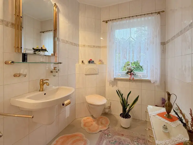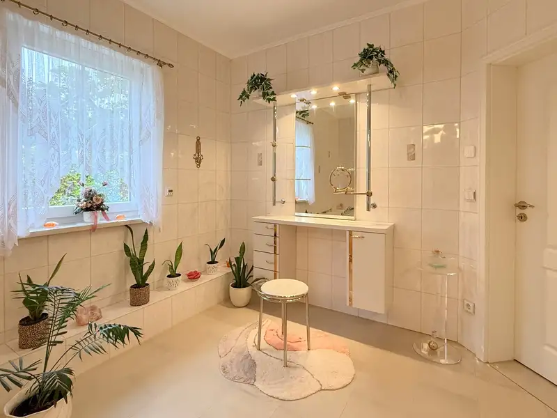 On the first floor, the bungalow impresses with its clear, spacious room layout. The spacious hallway leads to all areas of the house. The living and dining room impresses with floor-to-ceiling windows, a cozy bay window with dining table and direct access to the covered terrace. The separate kitchen is modernly equipped and offers space for cooking and enjoying meals together. The bathroom with corner bathtub and dressing table invites you to relax, while a guest WC and the bedroom ideally complement the space on the first floor.