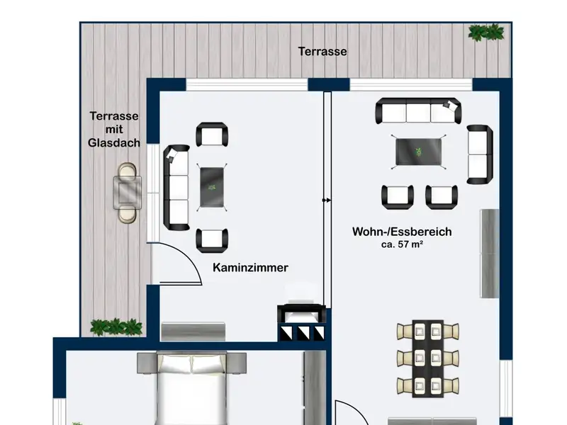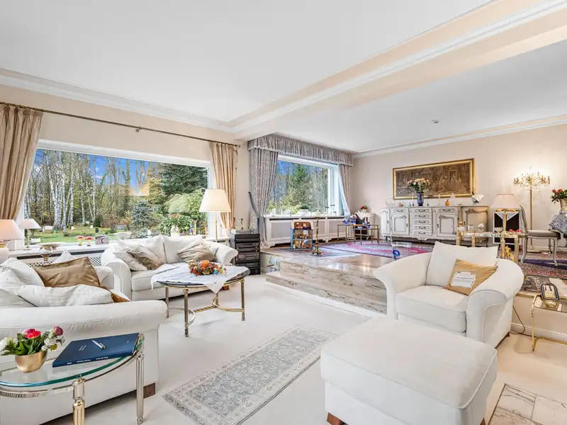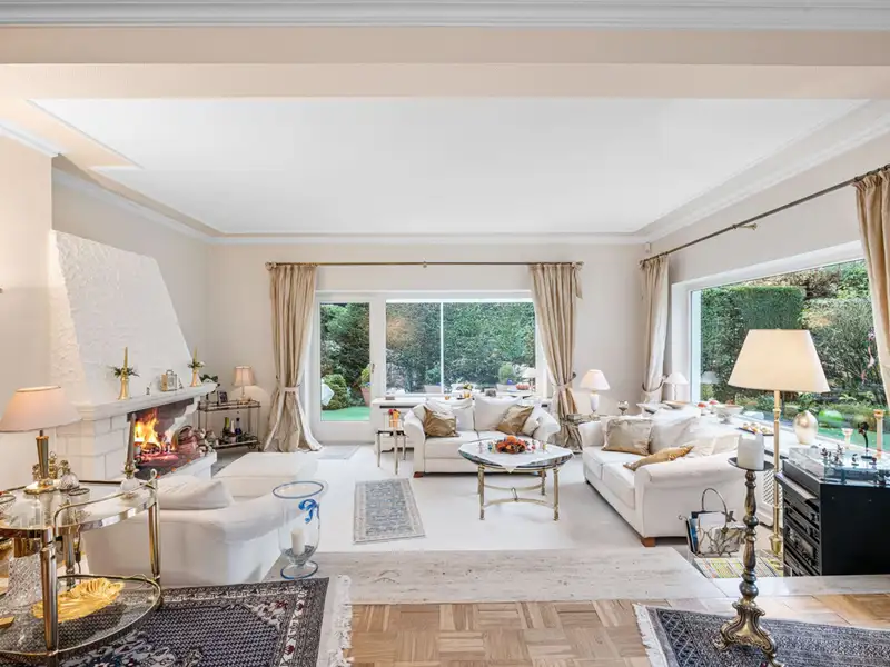 The hallway leads to the children's room/study, a bedroom, the guest bathroom, a full bathroom and the kitchen. The focal point of the house is a spacious, beautiful living/dining area with a fantastic, unobstructed view of the natural surroundings. The large window fronts provide sufficient light and skilfully combine the inside and outside. A fireplace ensures cozy hours here in the colder months. The step in the middle of the living area visually separates the spacious living area. Dining together at a long table with friends and family or games and reading evenings in the fireplace corner - there is plenty of space here for your feel-good concept. From the living room, you can step out onto the sheltered, glass-covered terrace and into the garden area, which borders directly onto the Lohe. Whether you want to use the garden for leisure activities or simply appreciate the peaceful surroundings, there are numerous possibilities for individual design.